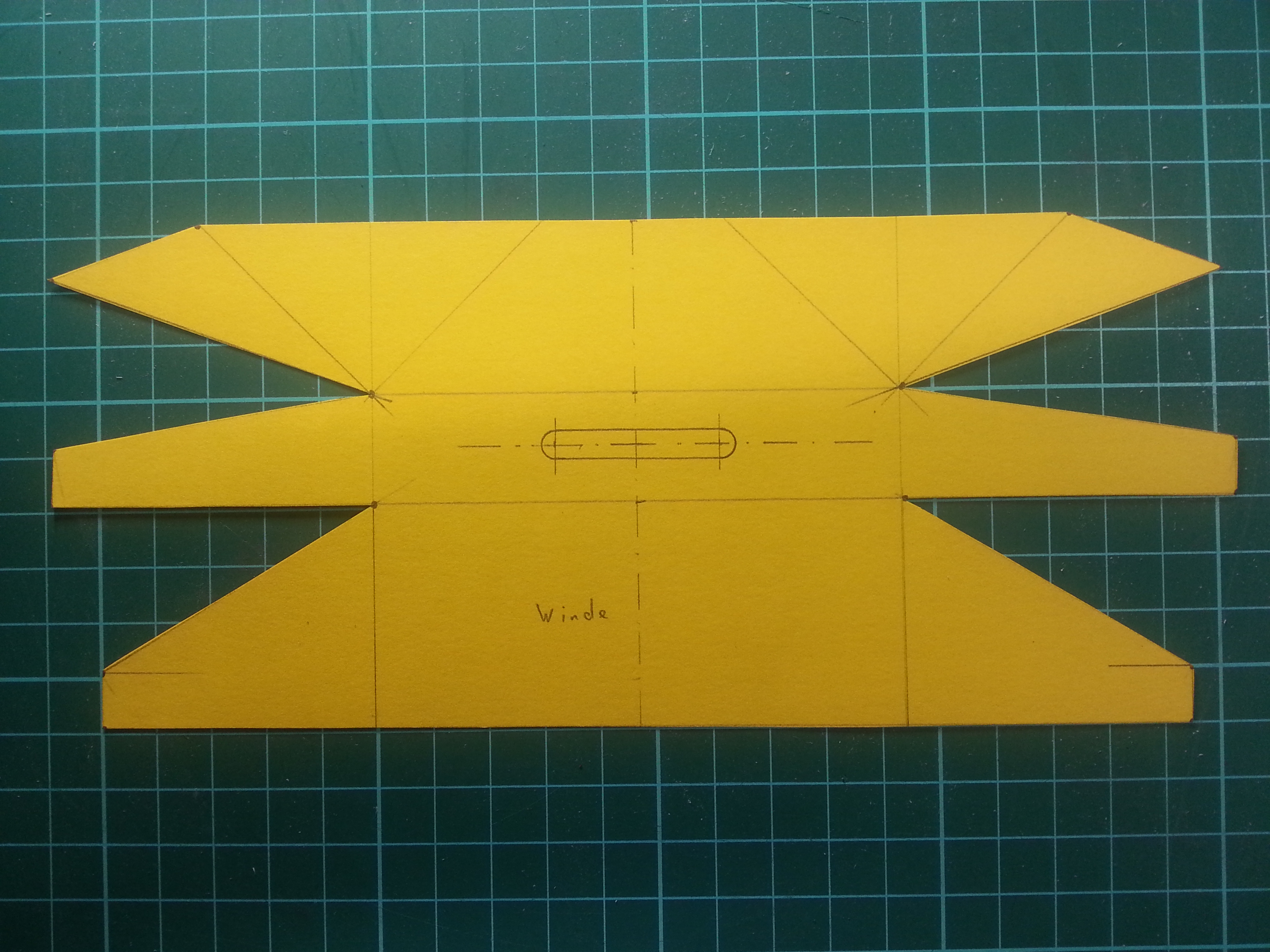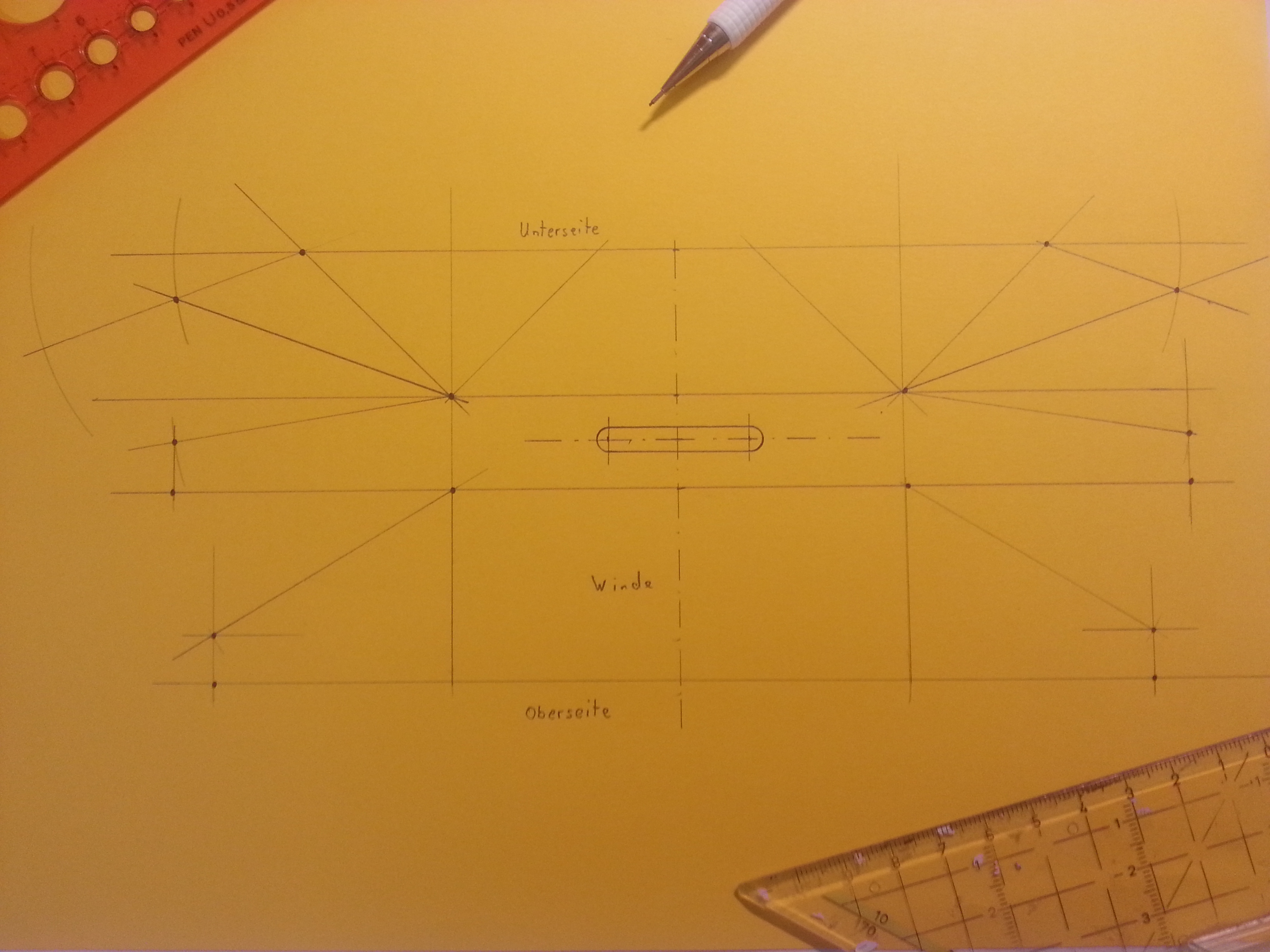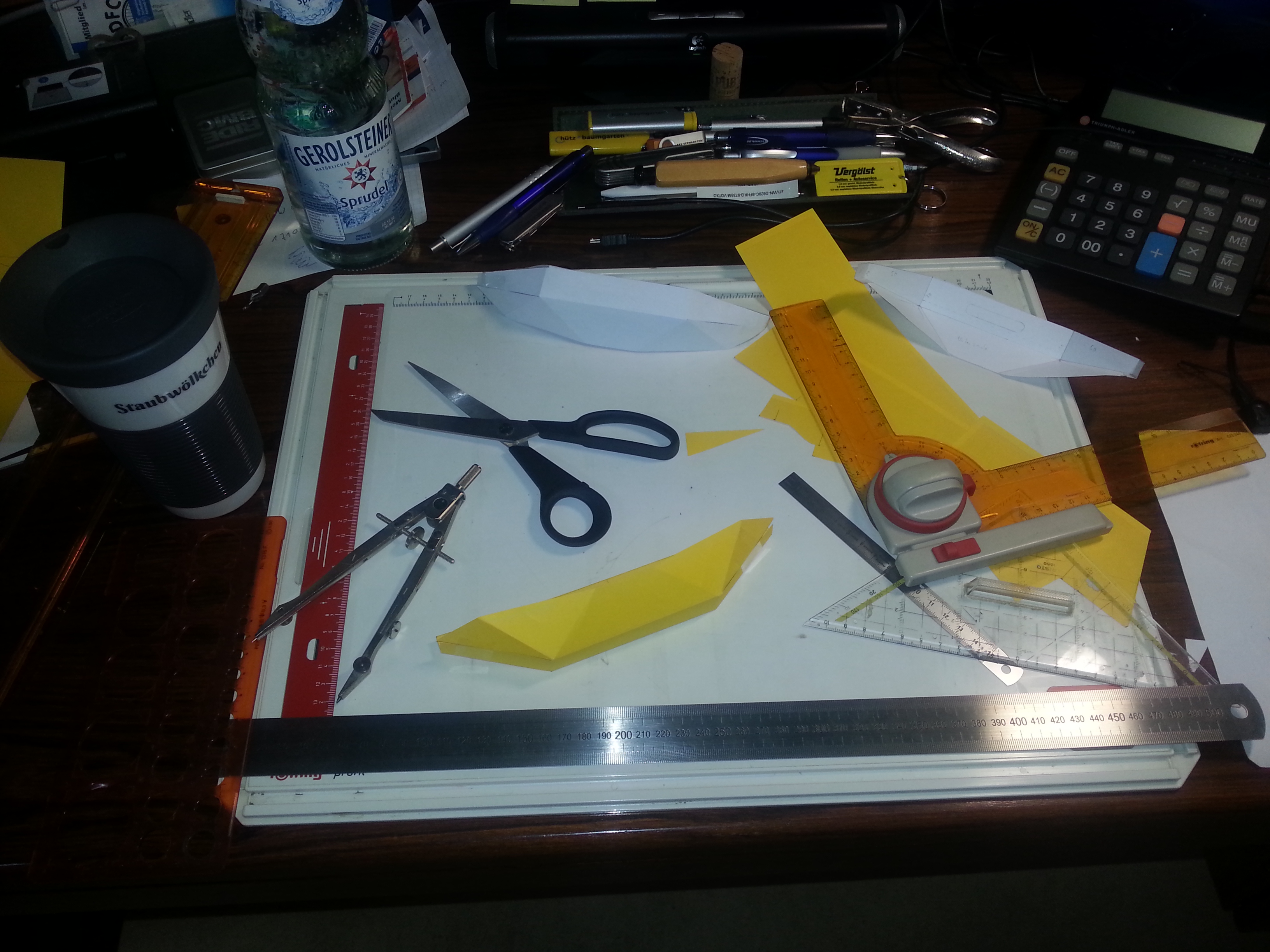 Nachdem schon der dritte Faltversuch ein zufriedenstellendes Ergebnis erbracht hat, erfolgte die Umsetzung auf stärkerem Karton. Dazu wurden mittels bewährtem Zeichenbrett die Einzelteile zu einer geometrischen Fläche, auch als Abwicklung bekannt, zusammengefasst. Zirkel und Geo-Dreieck waren dabei wichtige Utensilien. Ist schon verdammt lange her, dass ich die Zeichenutensilien das letzte Mal in Händen hielt.