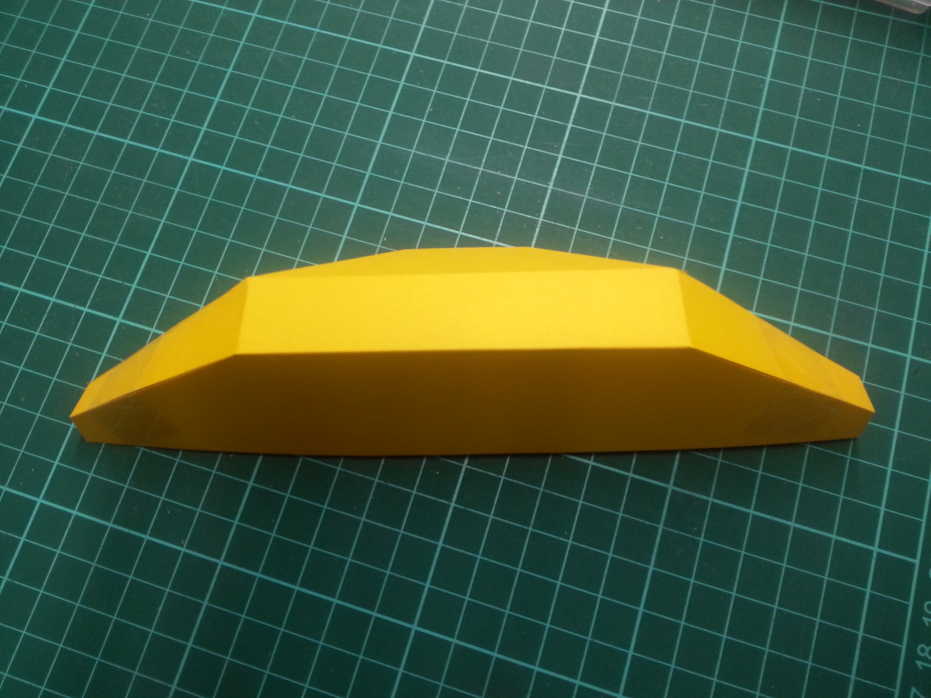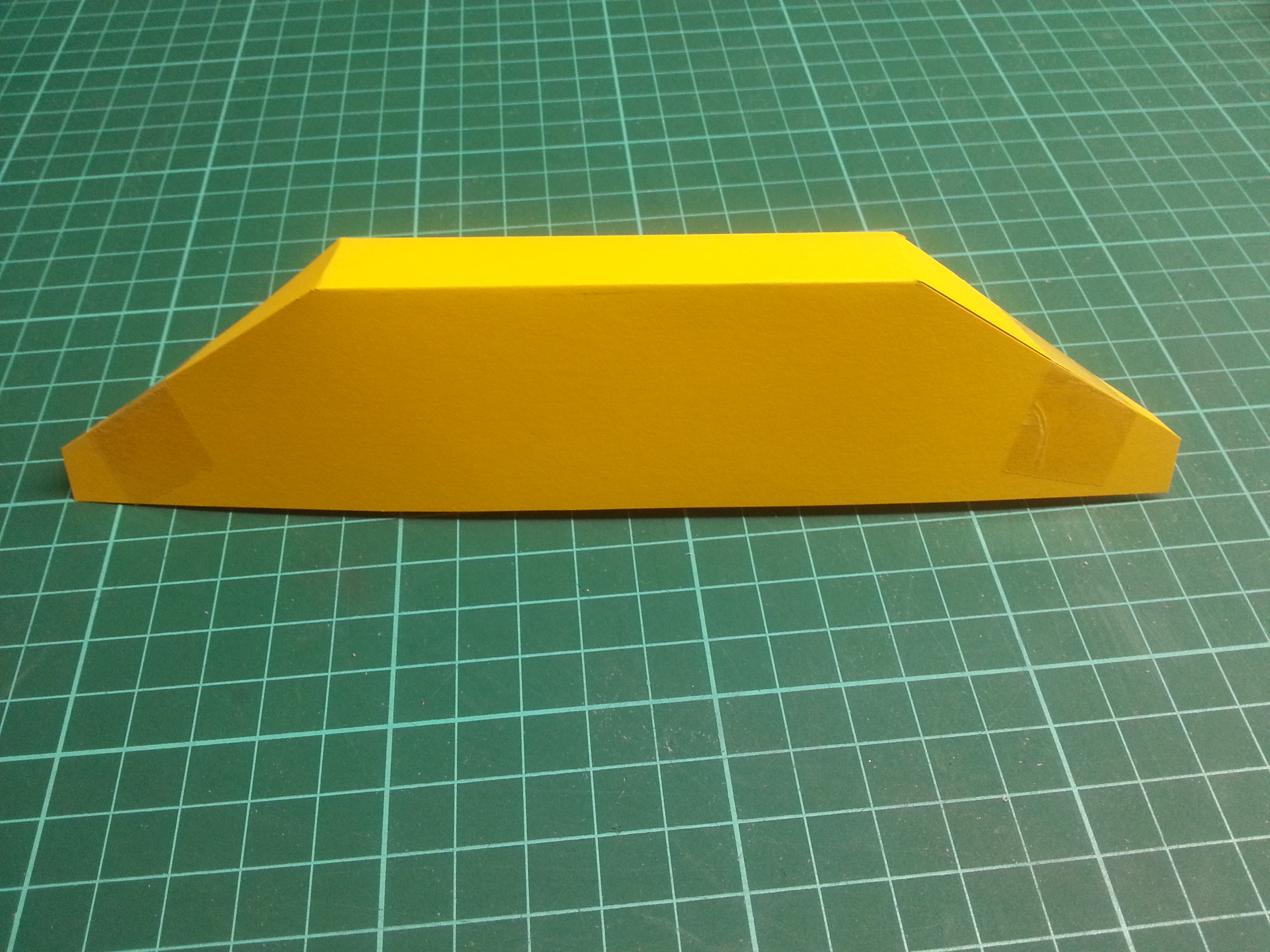 Beim Falten ist mir klar geworden, dass ein späteres Formen mit Alublech möglicherweise nicht in einem Stück funktioniert. Die sich überlappenden Formen behindern sich beim Biegen teilweise gegenseitig. Im schlechtesten Fall müssen zwei Segmente der Unterseite ausgespart und nachträglich eingeklebt werden. Auch ein kleiner Fehler in der Abwicklung ist noch aufgetaucht. In der Stoßstangen-Draufsicht fehlen noch links und rechts zwei kleine Segmente. Sie sind aber schon im Plan ergänzt worden, sodass der endgültige Übertrag auf Alublech fehlerfrei ist.