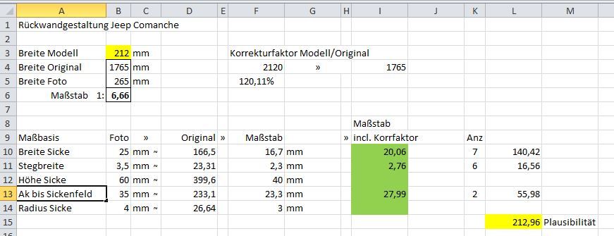 Ein schöner Rücken kann sehr entzücken. Nach diesem Motto wurde das fehlende Element am Comanche Fahrerhaus maßstabsnah konstruiert. Grundlage war auch hier ein Foto, bei dem die fehlenden Maße, nach bereits bekannten Muster ermittelt wurden. Die Fahrzeugbreite von 1765 mm (ohne Spiegel) war Basis für die Ermittlung der Werte. Leider ist die Modell-Karosserie auch deutlich breiter als im Original. Unter dieser Annahme würden die errechneten Proportionen der Rückansicht nicht zum Original passen. Daher habe ich die 20% Überbreite noch zu den errechneten Werten addiert. Auf den Punkt gebracht, wird die Anordnung der Vertiefungen also leicht in die Breite gestreckt. Nachfolgend die ermittelten Werte.