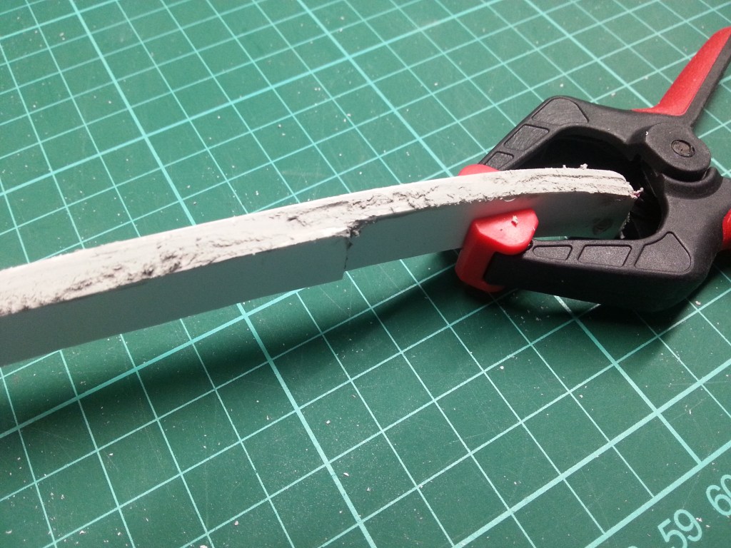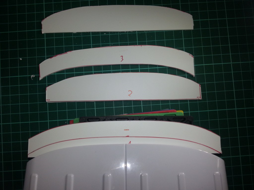 Da ich mit 1,5 mm starken PS-Platten gearbeitet habe, wurden somit drei Lagen erforderlich. Die vorbereitete erste Kunststofflage wurde bündig eingelegt und das Dachelement mit dem entsprechenden Überstand aufgelegt und provisorisch, aber ausgerichtet, mit Spannklammern fixiert. Parallel zum ersten Bogen wurde dann entlang der Dachkontur die zweite Linie aufgetragen. Siehe mit eins gekennzeichnetes Bauteil. Nach Bearbeitung, hier aber noch nicht endgültig fertig, sieht das Ergebnis wie Teil drei aus. Die beiden verbleibenden Plattenstücke wurden nun noch im gleichen Stil bearbeitet und anschliessend aufeinander verklebt.