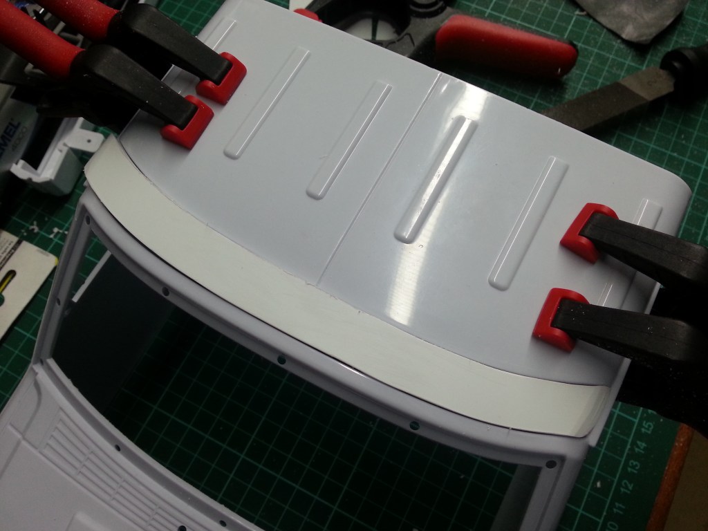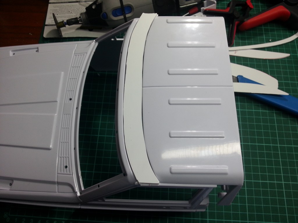 Nach vielen Berechnungen und Abwägungen war es heute endlich soweit. Ein erstes Bauteil wurde hergestellt und verschliesst die durch Verlängerung des Fahrerhauses entstandene Lücke im Dach.