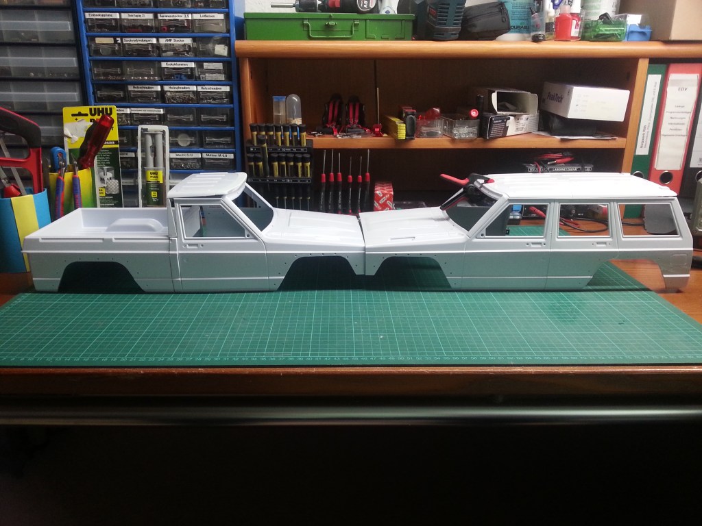 Die Dachstreben des Cherokee werden an der Schnittkante ca. 1 cm Richtung Frontscheibe herausgetrennt. Die Dachkontur dürfte ohne große Nacharbeiten in den oberen Rand des Heckfensters eingepasst werden. Es fehlt jetzt zum Schluss noch ein Bauteil, der untere Teil der Fahrerhausrückwand und die Fahrerkabine ist fast fertig. Final wird dann noch die vordere Rückwand der Ladefläche abgetrennt und die Seitenteile auf Länge gebracht. Nach dem Einpassen dieses Bauteils ist auch die Ladefläche wieder geschlossen. Im letzten Schritt muss nur noch die Lücke in den ehemaligen Fensteraussparungen der Fondtüren verschlossen werden und der Comanche wäre als Basis fertig. Die obligatorischen Spachtel- und Schleifarbeiten sind ohnehin fällig …
