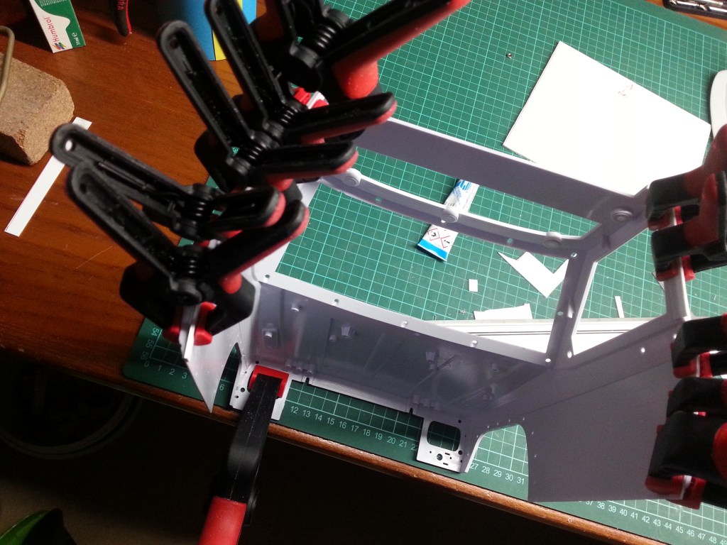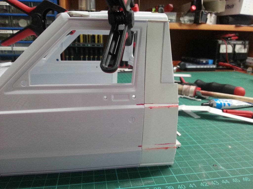 Vorab müssen aber Laschen an den Fahrerhausseitenteilen angebracht werden, um die Einzelteilen überhaupt miteinander verkleben zu können. Dazu wurden 8 mm breite und 1 mm dicke PS-Streifen an die Innenseite der Fahrertür geklebt. Eine Vielzahl von Spannklammern lassen das Ergebnis vorläufig nur erahnen.