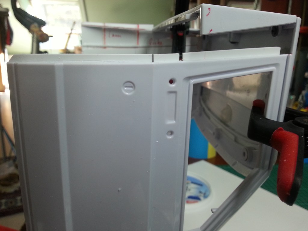 An den beiden Seitenteilen wurde ja schon je ein Verstärkungsspant zu Stabilisierungs-zwecken aufgeklebt. Hier noch ungekürzt links vor der Rückwand sichtbar.
