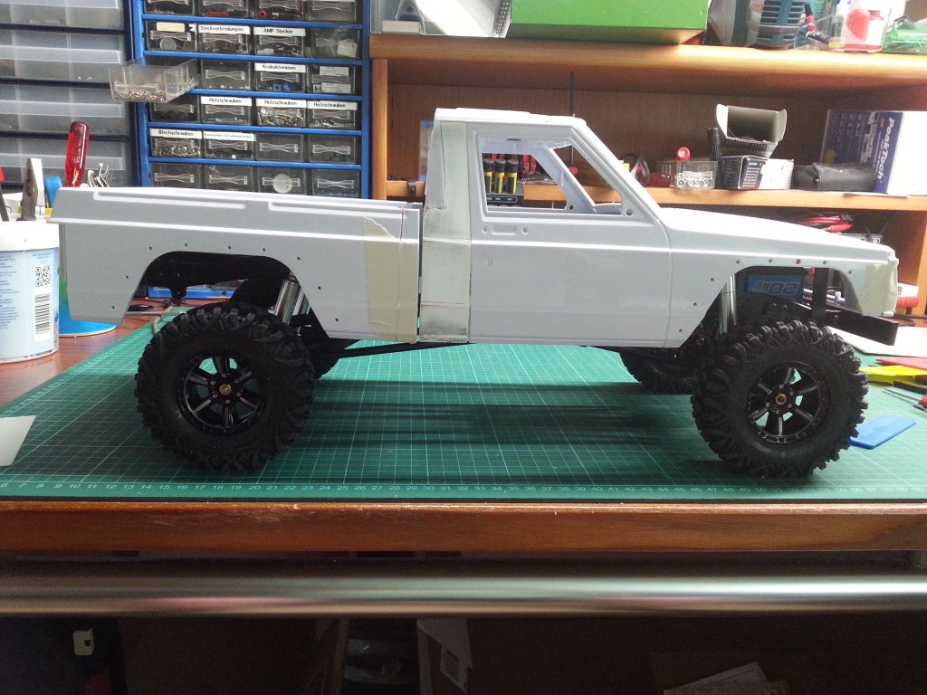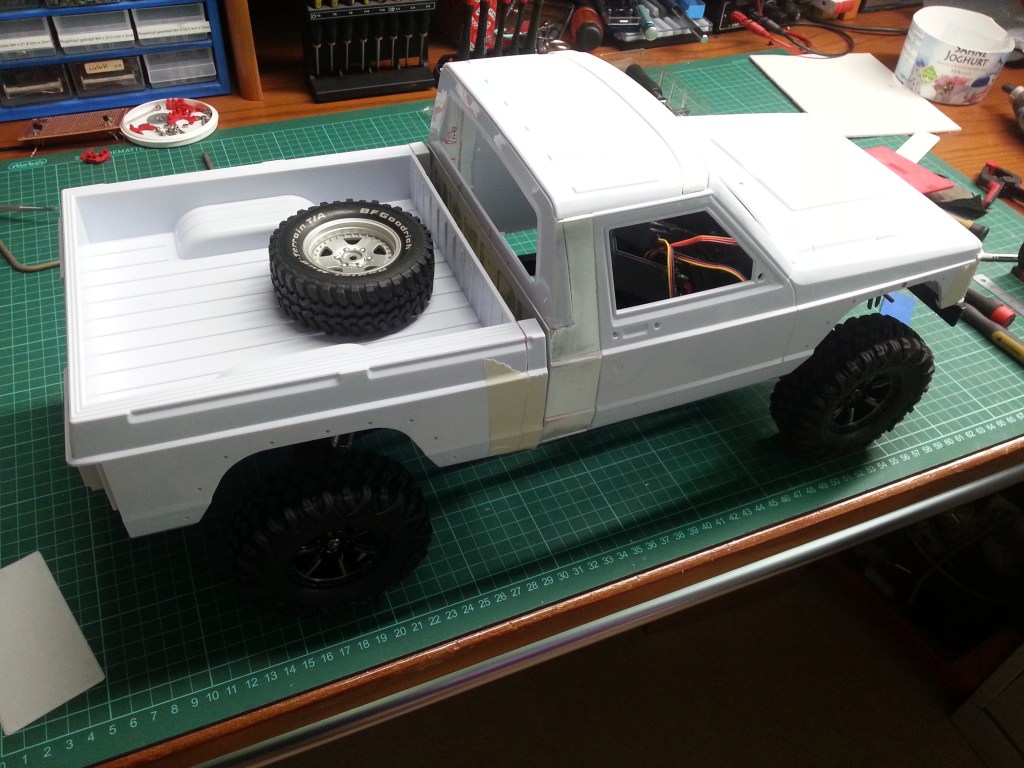 Zunächst einmal geht es am angefangenen Fahrerhaus weiter. Auf die Motorhaube kommt eine Lufthutze und zwei Abluftöffnungen für die Motorkühlung, ganz nach seinem Vorbild, dem JCR Manche. Da ich inzwischen ausser dem umgebauten Comanche noch eine neue Cherokee und eine weitere gebrauchte Comanche-Karosserie besitze, ist ein Schritt nahezu unvermeidlich. Das Heraustrennen der Motorhaube, zumindest an einem der beiden geplanten Comanche! Darunter wird sich irgendwann einen 6-Zylinder-Motorattrappe wiederfinden. 😉