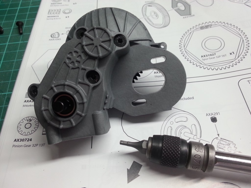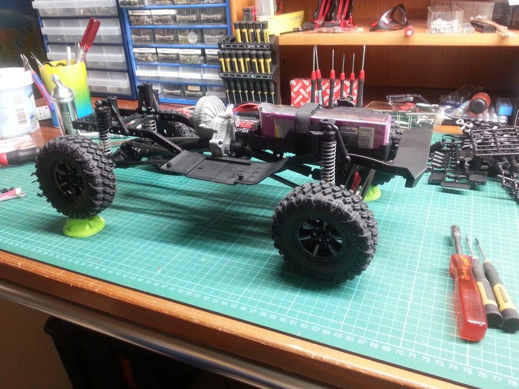 Einen Tag habe ich nun ausgesetzt um die Hände etwas zu schonen. Heute hat es der Axial Schritt für Schritt, aus vielen Einzelteilen dann auf die Räder geschafft. Nachdem alles bereit zur Fertigmontage war, habe ich noch etwas im Forum die neuen Beiträge studiert. Der Satz lesen bildet, hat sich dabei wieder einmal als unwiederlegbar herausgestellt. So ist ein Forumskollege das gleiche Problem etwas intelligenter angegangen. Er hatte mit einem M3-Gewindebohrer die Gewinde schon vorgeschnitten … 😦
