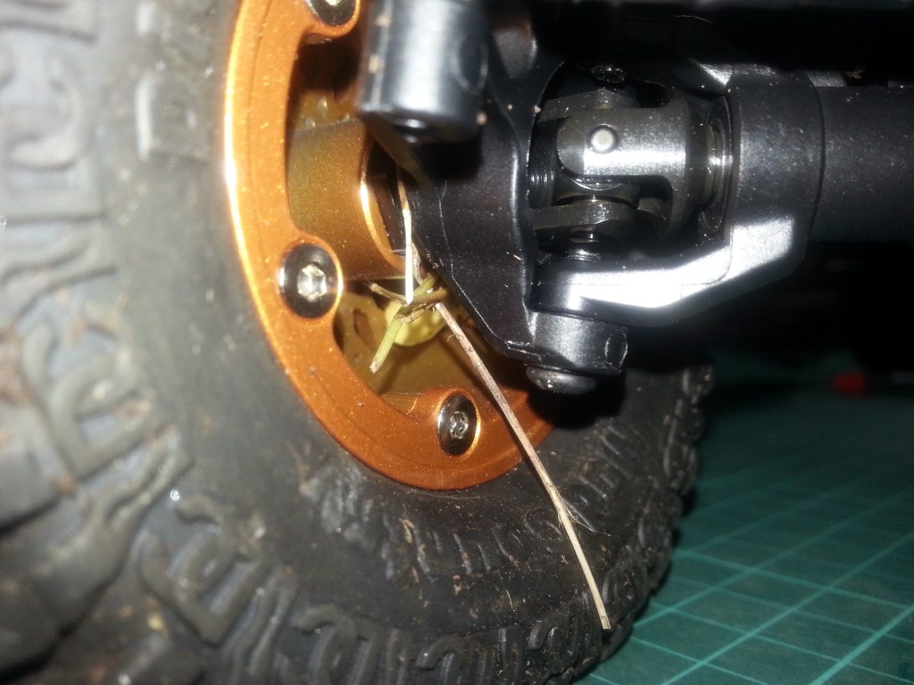 Entsprechende Bilder werden ganz sicher nachgeholt, aber nur mit Karosserie. Um deren Montage werde ich mich als nächstes kümmern. Zuerst lief ich noch den Spuren des Crawlers im Haus hinterher. Ich war wohl doch etwas zu intensiv in der Blumenerde beschäftigt. Eine innige Verbindung mit dem Reifenprofil war die Folge. Da musste ich mich etwas beeilen, um meiner Göttin keine Vorwände für eine Reinigungskrise zu liefern. Die ersten Wildkräuter haben auch gleich den Crawler ins Herz geschlossen und wollten nur mit Nachdruck von seiner Nabe weichen. 😉