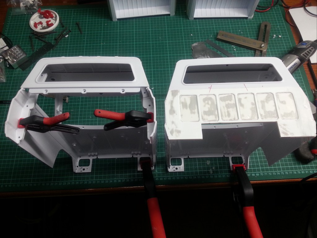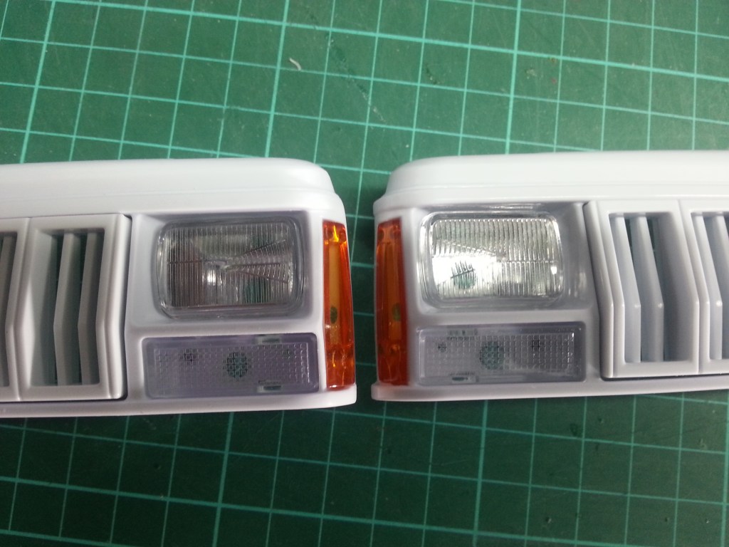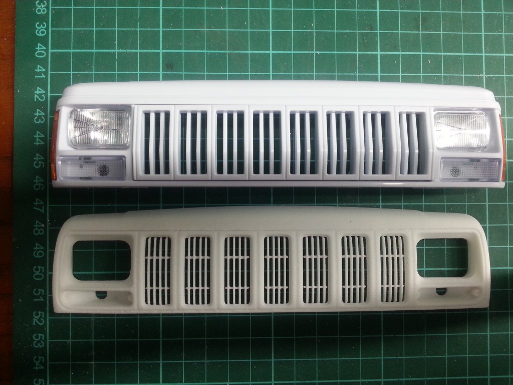 Vorweg, der rechte aufwändig, umgebaute Comanche geht selbstredend nicht in Rente. Er wird wie geplant aufgebaut, erhält dann aber einen Käfig mit Ersatzrad, anstelle der Ladefläche. Ein sogenannter Truggy. Die Türen werden nach unten erweitert, damit sich der Fahrer beim „Rangieren“ aus der Fahrerkabine hängen kann. Das dauert aber noch ein wenig, der Cherokee kommt zuerst auf die Werkbank und dann der orange JCR Comanche. Hierfür wurde inzwischen ein 3D-Druckteil angeschafft, um eine dem Original entsprechende Facelift-Variante nachbauen zu können, siehe Beitragsbild. Den Arbeitsaufwand wollte ich mir nicht antun, noch nicht. Die Anschaffung allerdings erfordert eine Menge Schleif- und Spachtelarbeit. Schon das zweite Teil in meinem Fundus, das Zweifel an der Anschaffung eines 3D-Druckers aufkommen lässt. So viel Nacharbeit hätte ich nicht erwartet. Die holländische Firma Shapeways nimmt dafür gut 50% vom Anschaffungspreis des kompletten Karosserie-Bausatzes, zuzüglich der eigens dafür hergestellen Einsätze für die unteren und seitlichen Blinkergläser. Modellbau mit Anspruch ist leider kein preiswertes Vergnügen, diesbezüglich sollte man sich keiner Illusion hingeben.