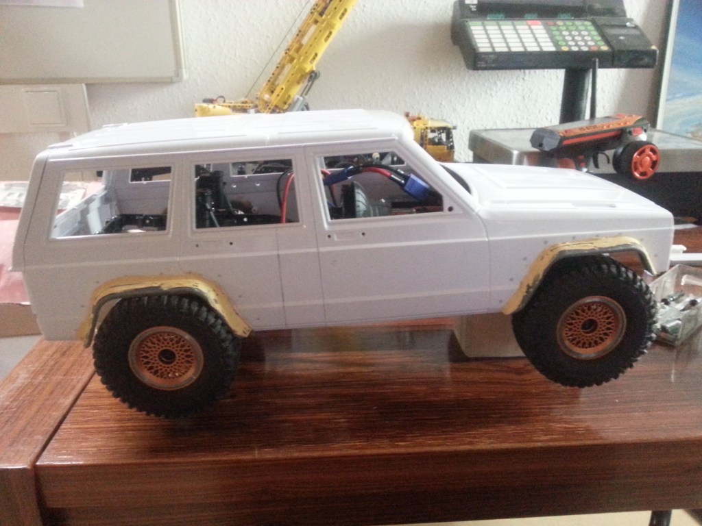 Nachdem mir nun ein fahrfertiges Chassis zur Verfügung steht, muss dringend eine Karosserie dieses Projekt abschliessen. Wie schon erwähnt, hatte ein sehr geschätztes Forumsmitglied aus Österreich, sein begonnenes Projekt verkauft. Eine Cherokee Karosserie mit bereits angebrachten starren Kotflügeln. Die entsprechen dem Original, anders als die Gummi-ähnliche Bausatzvariante. Er wird mit seiner späteren pazifik-blauen Lackierung und ohne Seilwinde ein eher moderates Einsatzgebiet haben. Ähnliches befürchte ich auch beim Nachbau des JCR-Comanche. Alle irgendwie fast zu schade um sie an Felskanten vorbei und durch Schlammlöcher zu manövrieren. 🤔