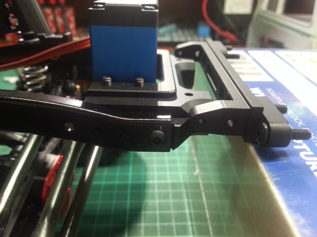 Im Heck wurde die Kunststofftraverse ebenfalls durch ein Alu-Bauteil ersetzt. Wie auf nachfolgendem Foto zu sehen, wird es ins U-Rahmenprofi eingeschoben und beiseitig verschraubt. Beide Bauteile stammen vom Hersteller GPM. Es gibt sicher noch mindestens ein Dutzend weiterer Hersteller, die entsprechende Teile für die Axial Chassis liefern könnten, in beliebigen Farben wenns gefällt. Die neue Stoßstange von SSD wird mittels zweier 7,5 mm Rundsstäben, in die bei Axial Rahmen identischen runden Aussparungen eingeschoben und ebenfalls verschraubt. Verschiedene Bohrungen lassen eine horizontale Verschiebung, zur Anpassung an verschiedenste Karosserieabmessungen zu. An den überstehenden Ösen werden jeweils noch Schäkel eingeschraubt.