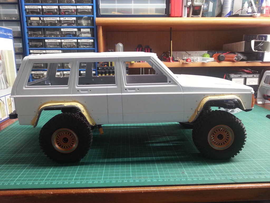 Zum Abschluss noch ein Profilbild des Cherokee. Schon unbeladen, ohne Akku und Inneneinrichtung liegt die Karosserie hinten zu tief. Vielleicht ist der umgehende Federtausch doch mein nächster Bauschritt. 😎