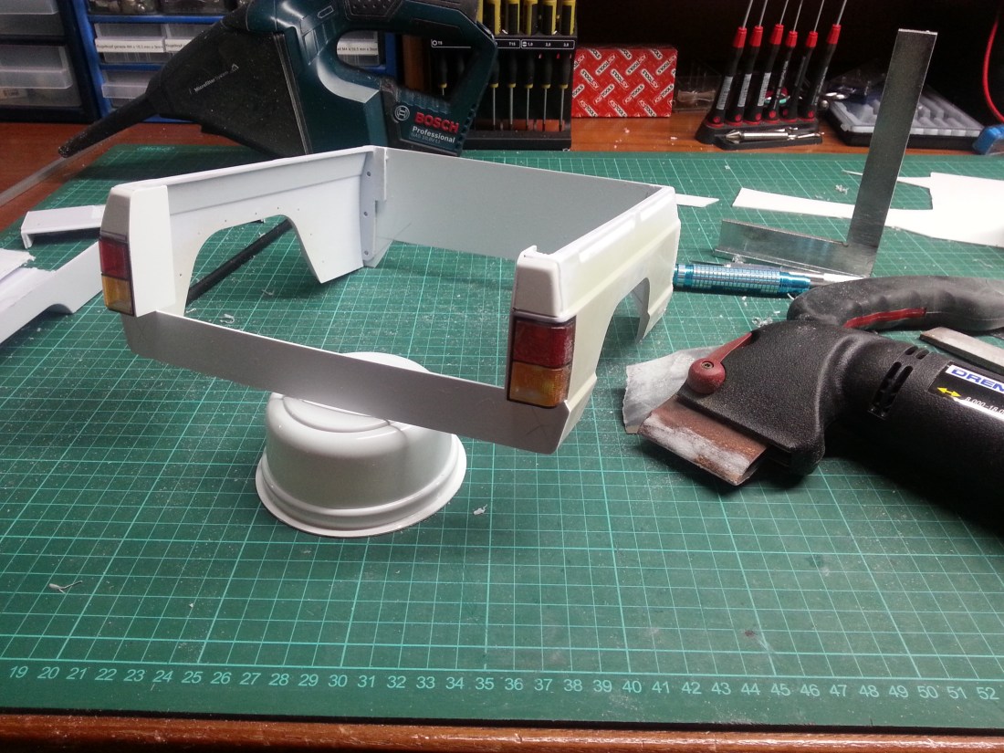 Nachdem das zerlegen der Baukastenpritsche abgeschlossen ist, wurden die Sägeschnitte am Übergang der Rücklichter zur Ladeklappe kleinteilig verschlossen. Ebenso ist nun die erforderliche Aussparung an der vorderen Ladebordwand ausgearbeitet worden. Oberhalb der Rücklichter wurden beidseitig kleine PS-Stücke eingeklebt, um den wesentlich steileren oberen Rand am Heckabschluss realistischer darzustellen. Nachfolgend die derzeitigen Bauschritte. Die Rückseite nach … Weiterlesen Ladefläche, der nächste Schritt