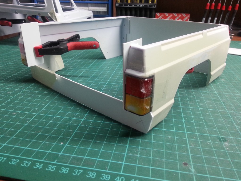 Hier mit dem eingepassten Profil oberhalb der Rücklichter, schon an die Konturen angepasst und verschliffen. Auch der seitliche Rand der Ladebordwand und die umlaufenden Kanten sind gerundet und geglättet. Die Vorarbeit für die erste Spachtelung …