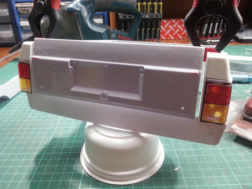 So sähe die Heckpartie aus, wenn keine weiteren Änderungen vorgenommen würden. Erkennbar der alte Übergang am oberen Rand, nachdem links und rechts an den Ecken kleine Teile aufgeklebt wurden …