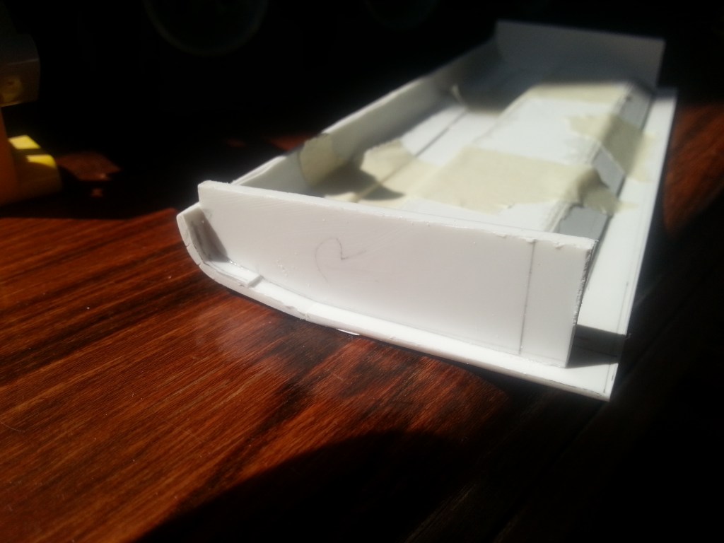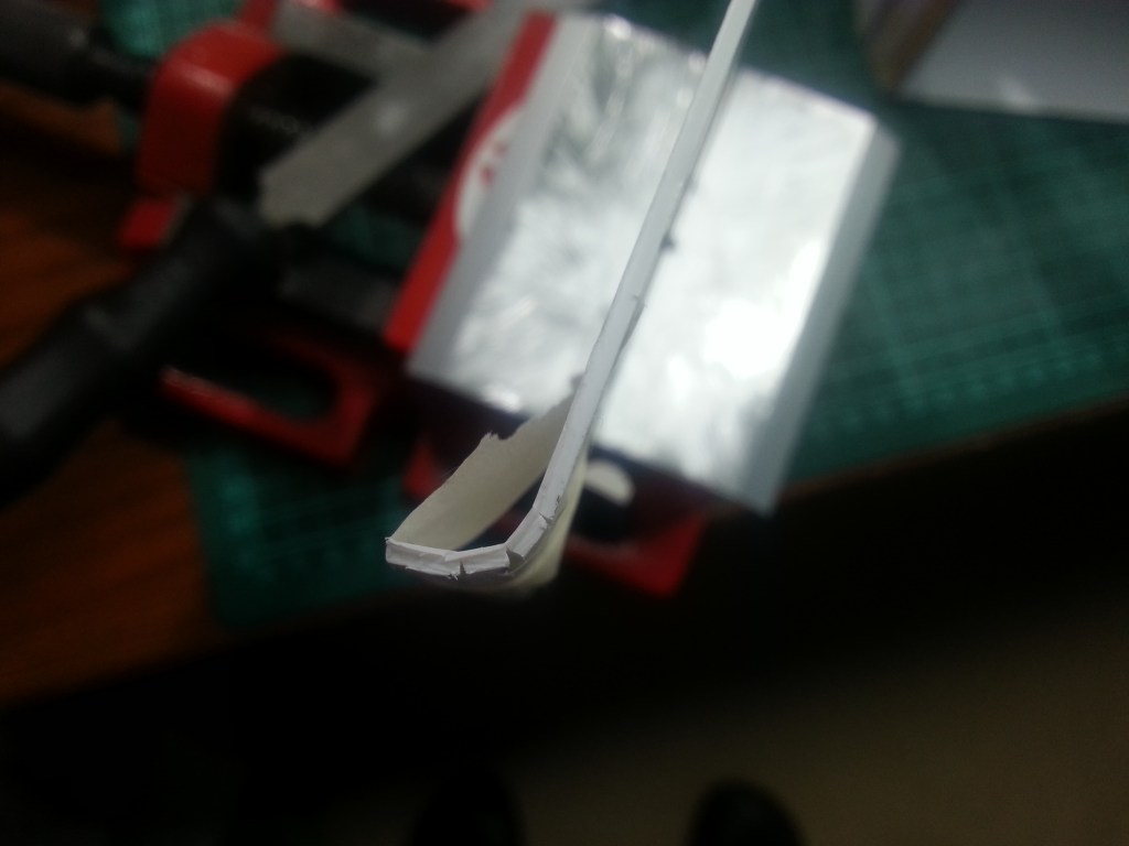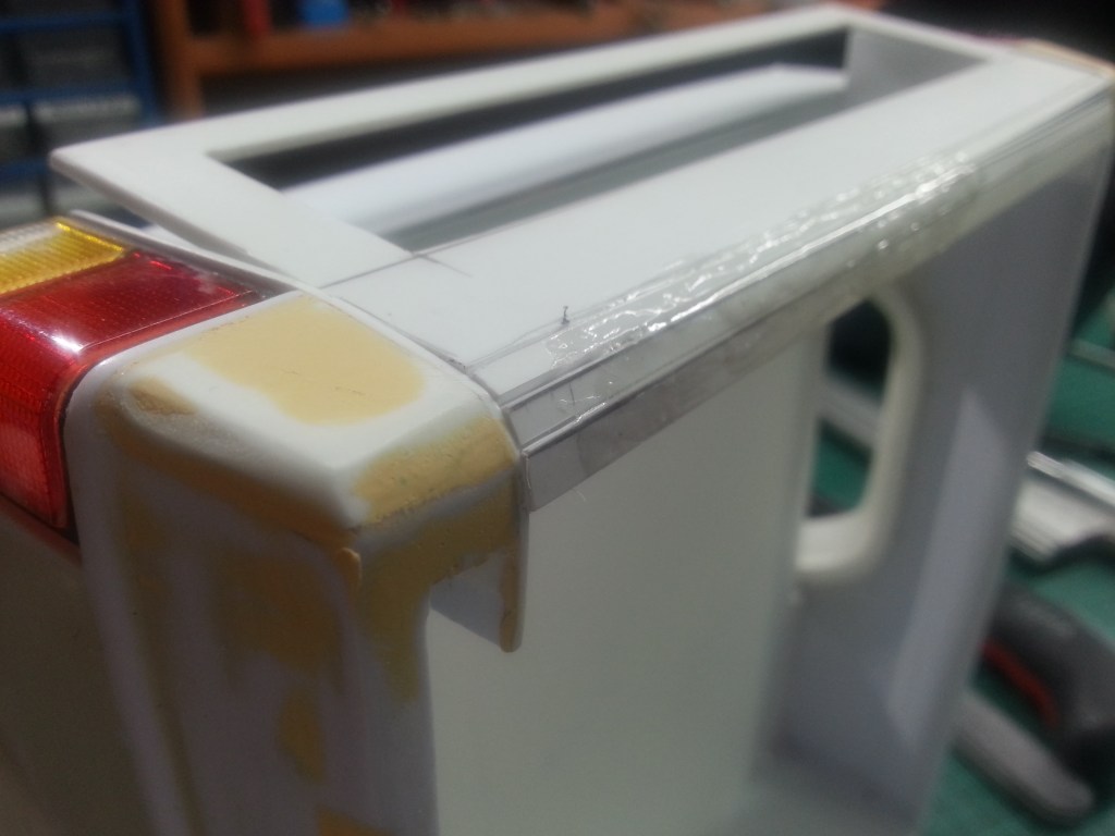 Nun wie schon angedeutet, einige Blicke auf die Fortschritte der vergangenen Tage. Zunächst ein Foto vom Profil der Heckklappenoberseite. Hier habe ich versucht, die Kontur der Kotflügel aufzunehmen. Zwei Möglichkeiten der Realisierung standen zur Debatte. Einmal das favorisierte Einkerben der Oberfläche, um durch Biegen eine angedeutete Verformung zu erreichen. Alternativ war auch das mehrlagige, verkleben einiger PS-Platten angedacht, die ich dann an den Innen- und Aussenradien rund gefeilt und geschliffen hätte. Entschieden habe ich mich, für die auf dem Foto gezeigte Variante. Ich will es vorweg nehmen, ein sehr schmaler Grad zwischen Erfolg und Niederlage. Permanente Bruchgefahr hat mich, bei den so geschwächten Platten, wie ein Schatten begleitet. Um die Kontur zu erhalten, wurde mit Malerkrepp eine Zwangsfixierung erreicht.