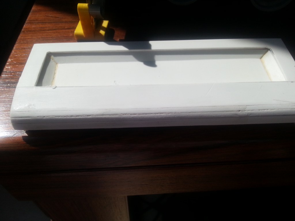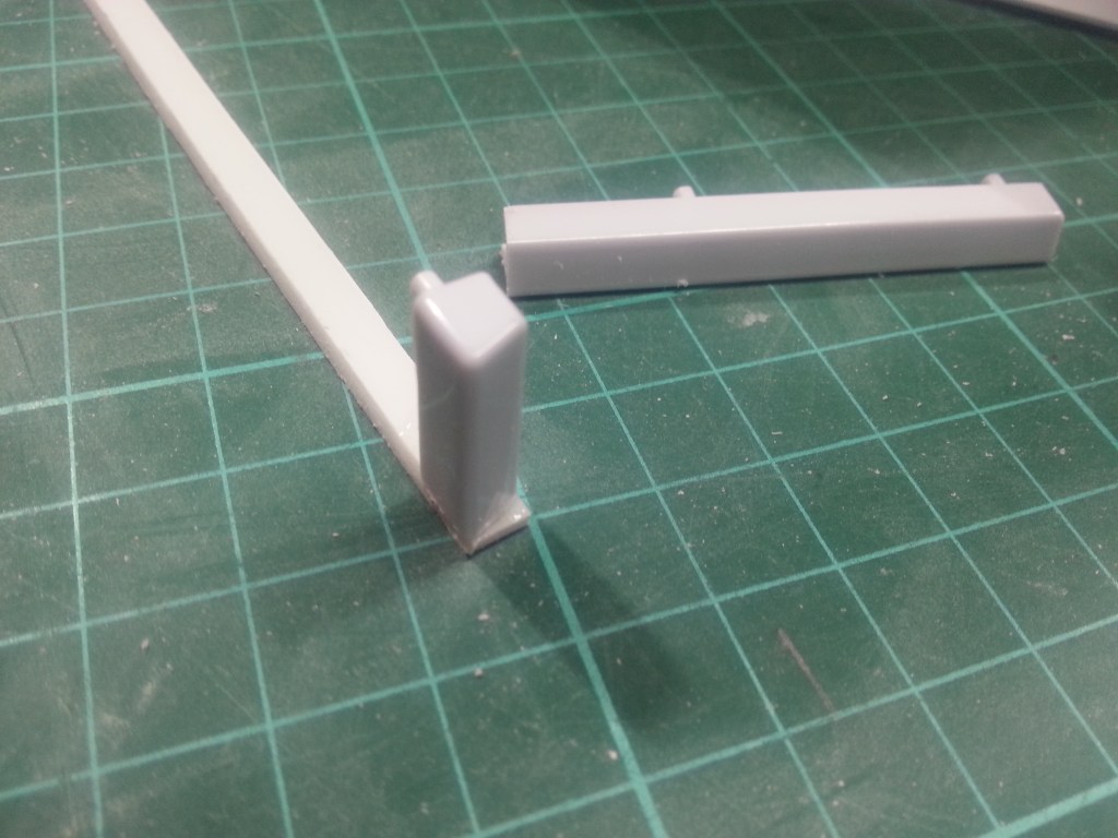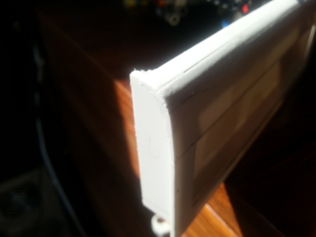 Weitere Schritte waren somit erforderlich. Zunächst wurde an der Innenseite der Biegung, eine hauchdünne Verstärkung aus PS aufgeklebt. Mit einem Alurohr und kleinen Zwingen wurde die Rundung bezwungen und stabilisiert. Zwei an die Kontur angepasste Seitenteile wurden in Folge hergestellt und schliesslich verklebt. Auf dem folgende Bild sind alle Innenverstärkungen zu sehen. Die seitlichen Abschlüsse in Länge und Tiefe noch unbearbeitet, weil die Handhabung beim schneiden solch kleiner Teile, doch sehr grenzwertig ist. Alle Bauteile werden ja mit einem Schneidlineal und Teppichmesser aus den vollen Materialplatten herausgeschnitten. 🤔