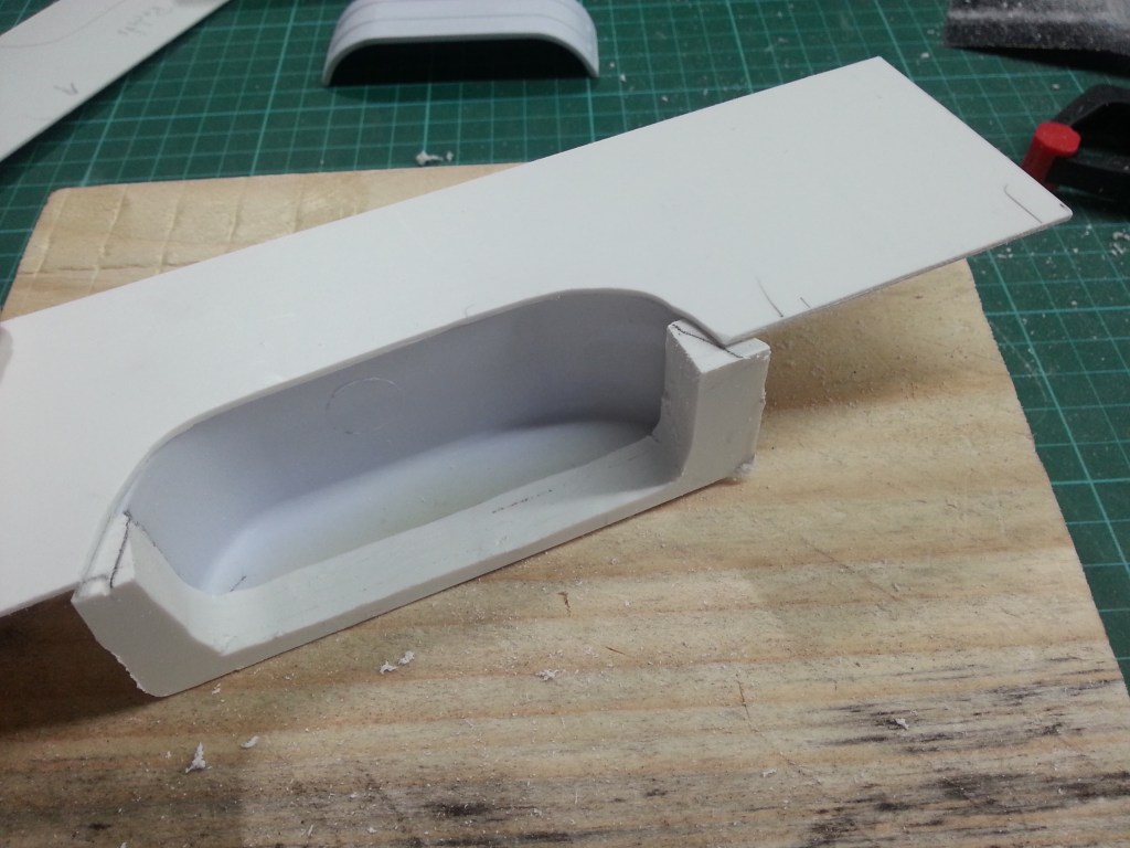 Im weiteren habe ich aus meinen PS-Resten, stapelfähiges Material gesucht. Der Höhenausgleich beträgt insgesamt einen Zentimeter. Dessen Grundfläche musste natürlich zum bestehenden Kotflügelprofil passen. Diese wiederum wurden untereinander verklebt. Auf einem Schmirgelpapierbogen wurde schliesslich eine Seite sauber begradigt. Sie wird später den Radkastenabschluss, an der Innenseite ergeben. Das wird in den nächsten Schritten erkennbar.