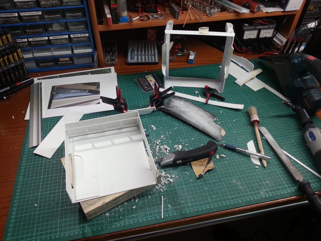 Dabei wurde mir leider auch klar, dass ich bei der Größenauswahl der gestuften Grundplatte doch etwas zu hoffnungsvoll war. Für die endgültige Konturenanpassung fehlte an der Aussenseite „etwas Material“. So habe ich die gestuften Absätze etwas befeilt und mit Kunststoffstreifen wieder aufgefüttert. Wo nichts ist, kann leider auch nichts angepasst werden. Das Ergebnis folgt.