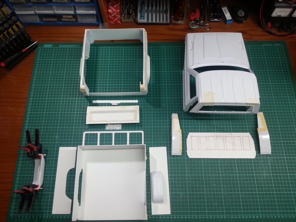 Also ein neuer Reinigungseinsatz und die bereits gebauten Teile, auf dem sauberen Arbeitsplatz wieder fürs Abschlussfoto ausgebreitet.