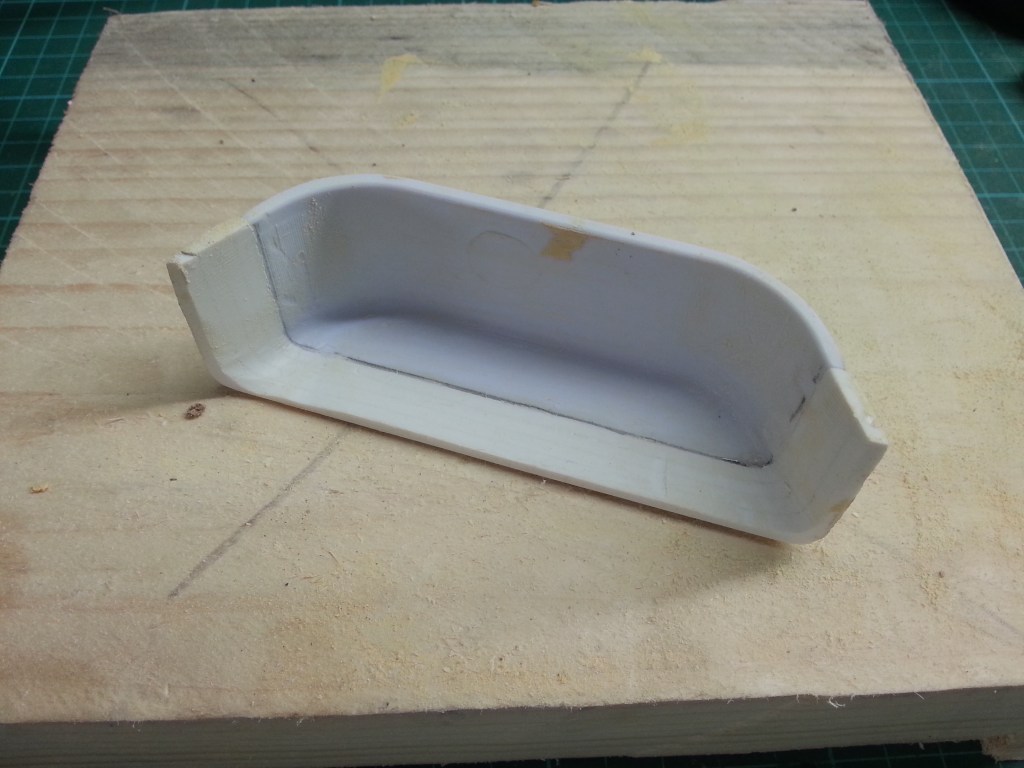 Jetzt noch einen Blick auf den erhöhten Radkasten, nach den ersten Schleifarbeiten. Die nachträglich aufgeklebten Kunststoffstreifen haben ihren Zweck nicht verfehlt. Damit ist auch klar, beim zweiten Radkasten werde ich die Grundfläche gleich größer auslegen. Das aus dem vollen Material herausgearbeitete Profil ist aufwändig, aber es funktionierte. Auf den folgendenen Bilder ist Aussen- und Innenseite, des nahezu fertig geschliffenen Radkastens zu sehen. An meinen Spachtelkünsten muss ich noch ein wenig arbeiten. Zum üben gibt es aber noch Flächen genug. Nach meiner ersten Einschätzung habe ich zu oft die Flächen mit der Spachtelmasse bearbeitet. Schon beim ersten Aufziehen war eine augenscheinlich gute Menge vorhanden. Dabei hätte ich es wohl besser belassen. Jeder weitere Schritt war einer zu viel. 🤔