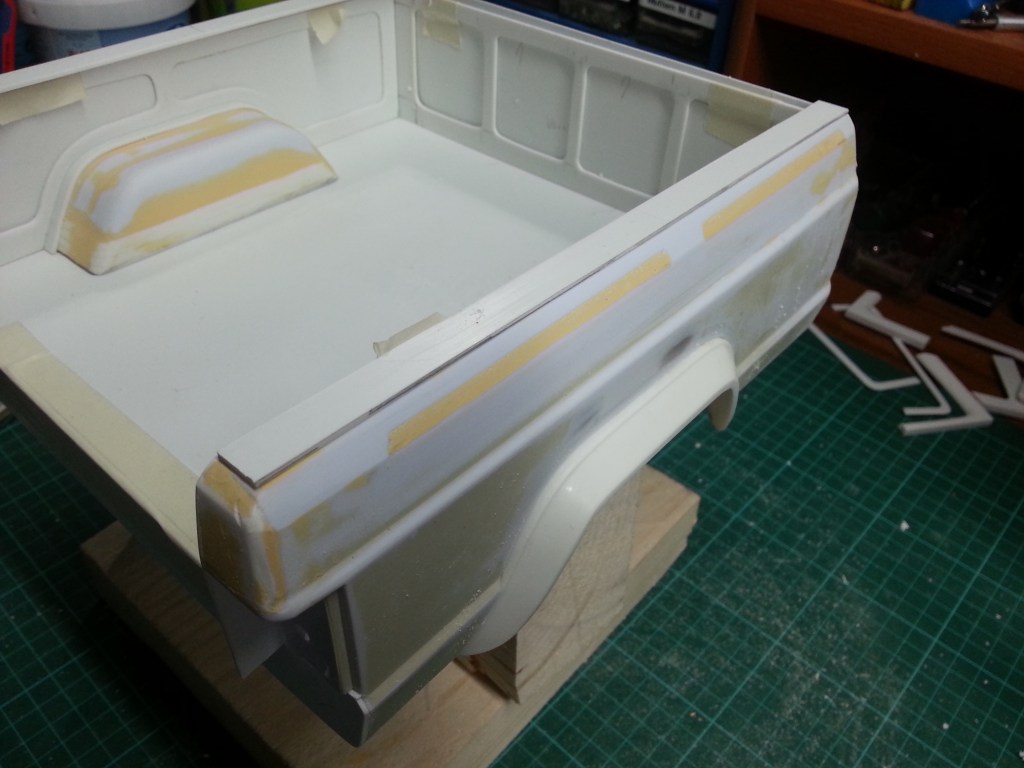 Vor Verklebung der Umrandungsverkleidung, wurden die Reste der Fenstersäulen weggeschliffen. Wie zu sehen ist, habe ich eine neue Kante am unteren Rand der Fenstermulden angesetzt, die durch die gelbliche Färbung der Spachtelmasse noch erkennbar sind. Beim nächsten Arbeitschritt wird sie so geschliffen, dass sie in die seitlichen Abdeckungen der Ladefläche auslaufen wird. Mit geringfügigem Materialübermass, geht es an die erste Feinjustierung. Auf Länge gekürzt und in der Breite an die Konturen angepasst.