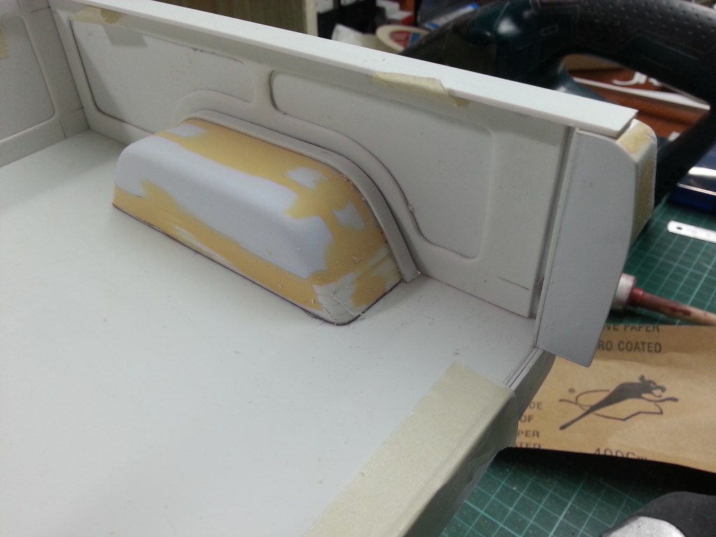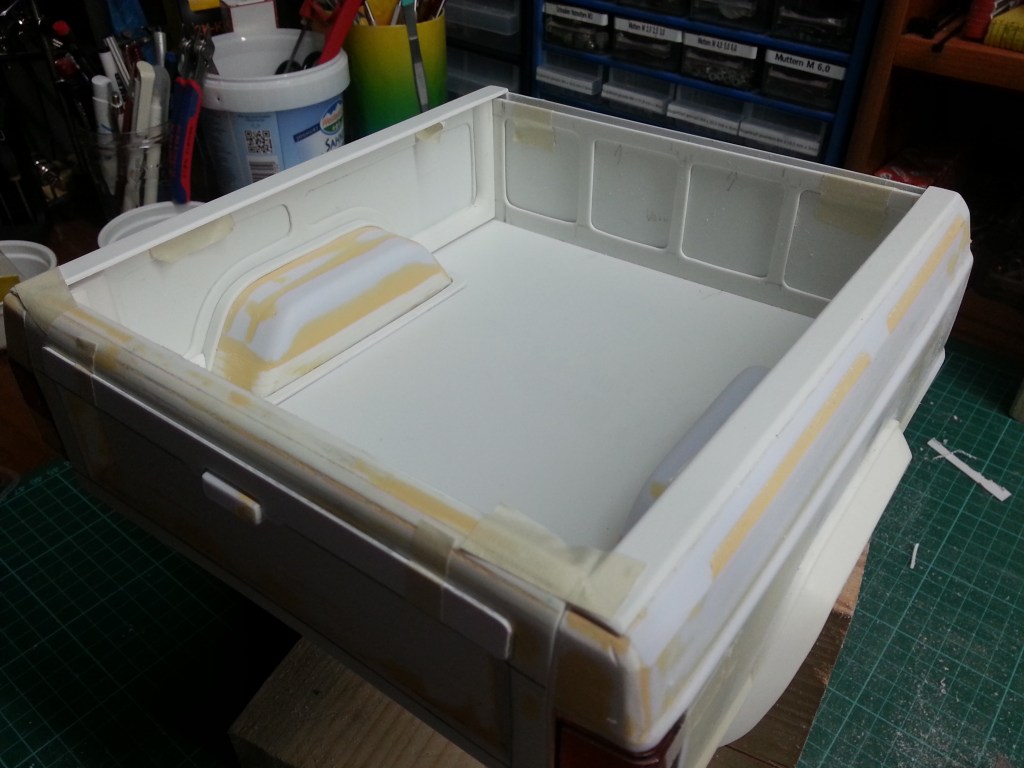 In einem weiteren Arbeitsschritt, wurden die beiden Abdeckungen verklebt, und wie vorher beschrieben mit dem schon vorbereiteten Karosserieprofil bündig geschliffen. Nach noch mindestens einer Lage Feinspachtel, rund um die äusseren Konturen, hoffe ich hier mit den seitlichen Abdeckungen am Ziel zu sein. Die Rundung der oberen Ladeklappe, wird noch mittels Feinspachtel auf die Ecken übertragen.