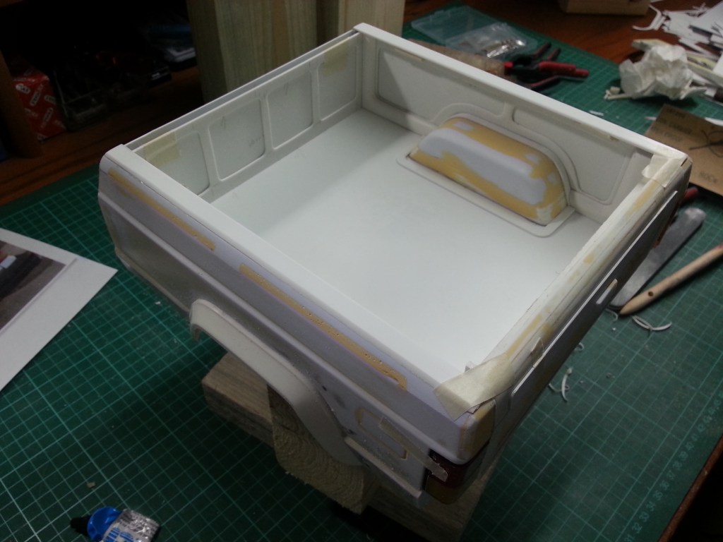 Ein bisher ungekürztes Bauteil, wurde dabei auch auf seine endgültige Form getrimmt. Die inneren Abschlüsse der Rückleuchten, rechts am Ende der Ladefläche.