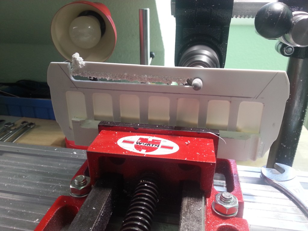 So nebenbei noch einige Fräsarbeiten an der Fahrerhausrückwand. Die Aussparung anzeichnen und grob das erste Element ausarbeiten…