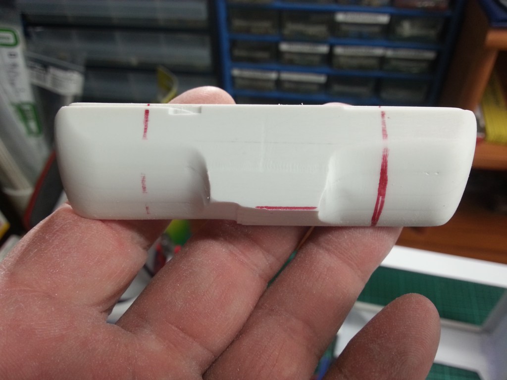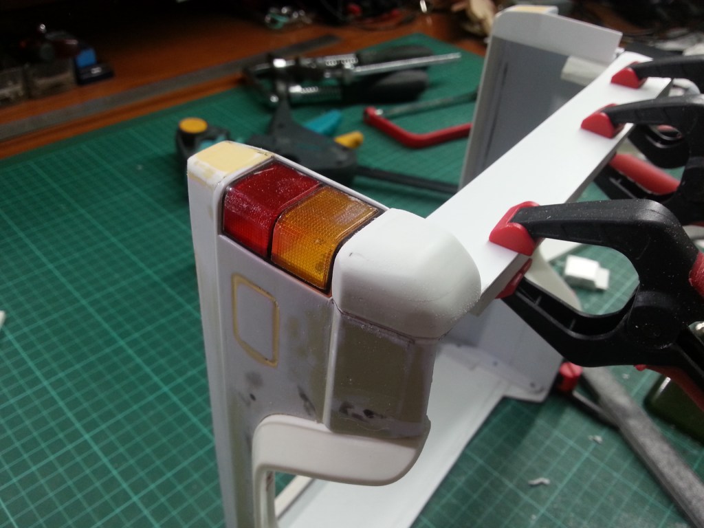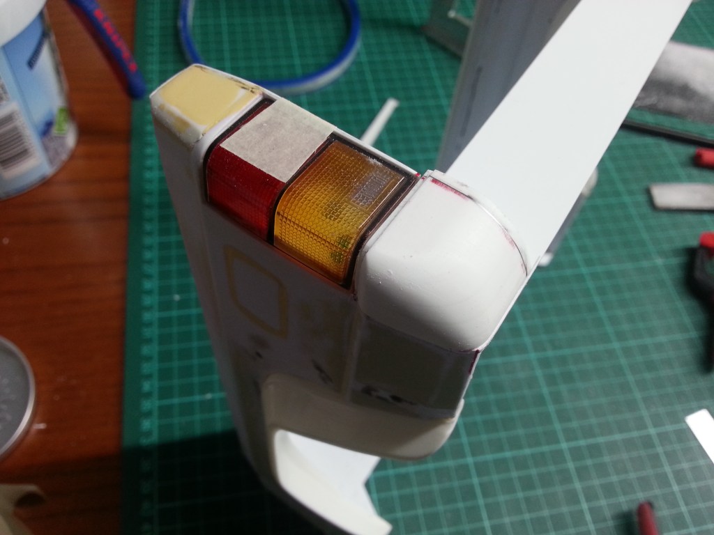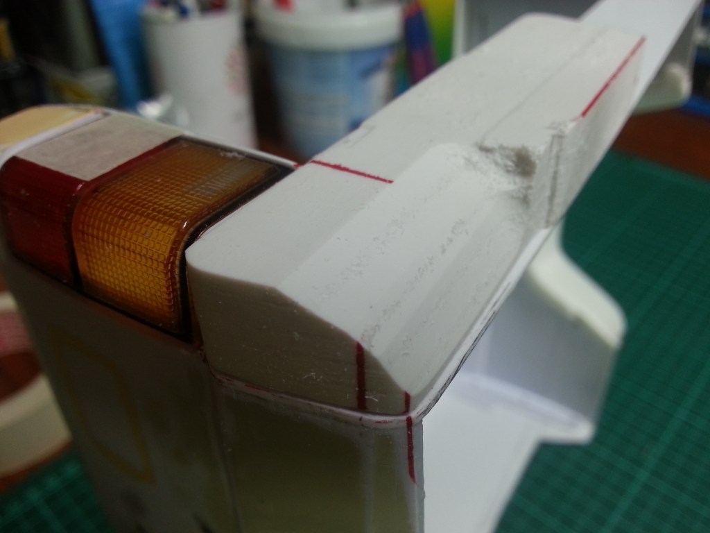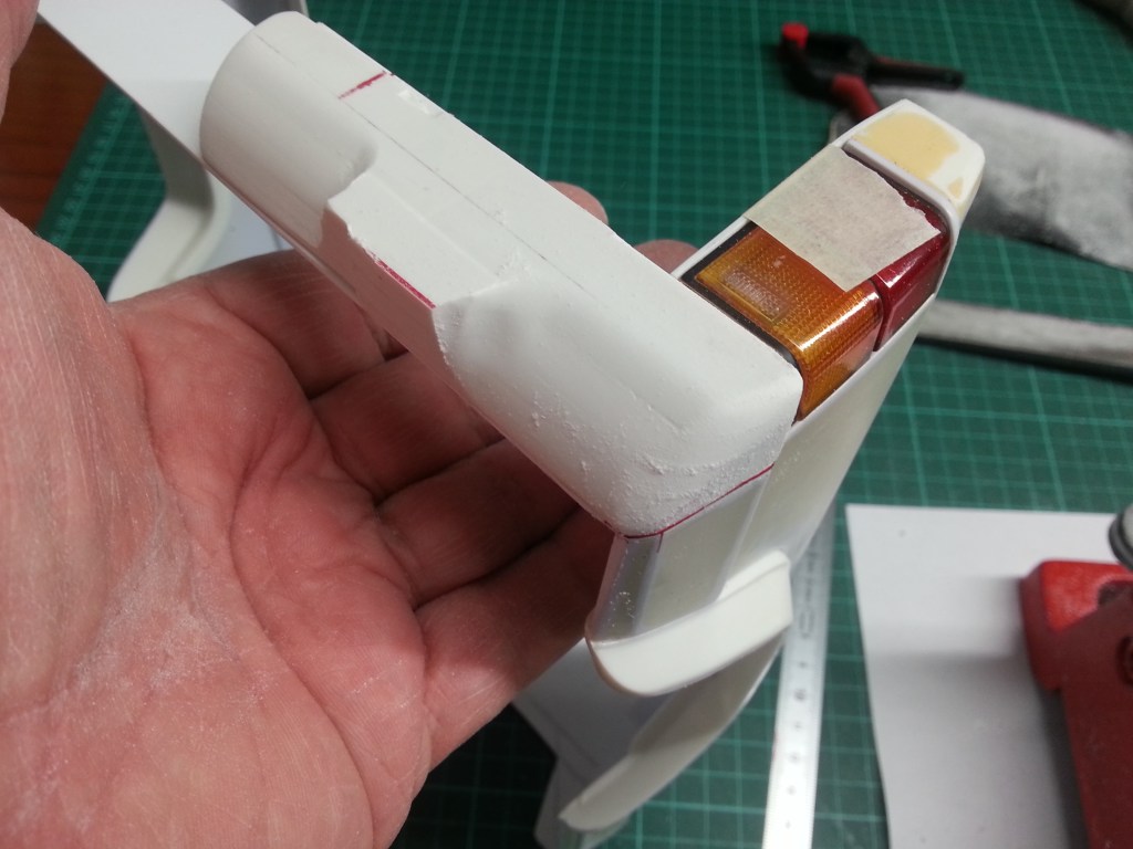 Die folgenden Bauschritte waren eine Kombination aus Fräsungen auf dem Koordinatentisch, schleifen mit Dremel, als auch mit der Hand. Bei dem kleinen Falz um das Rücklicht, wurde noch die gerade Schneidklinge eingesetzt. Schnitzen in Reinkultur eben. Die kleine Fase seitlich des Rücklichtes, wurde im 45° Winkel auf dem Koordinatentisch hergestellt. Ansonsten feilen, schleifen, anpassen, schleifen.