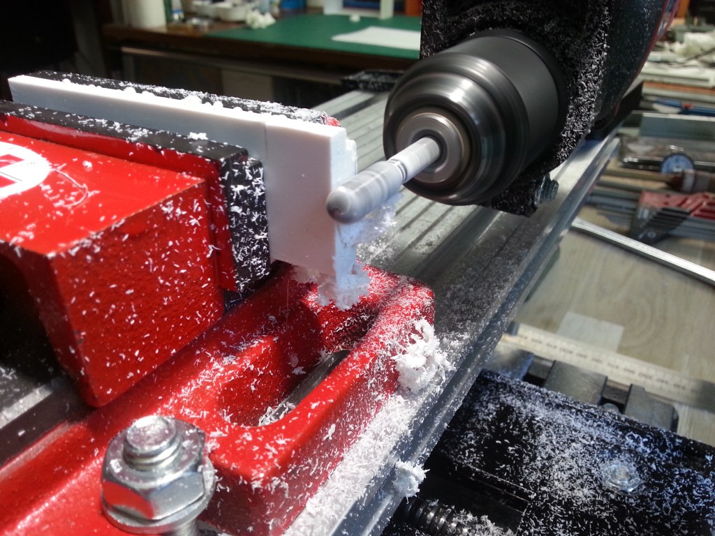 Im ersten Bauschritt wurden zwei Flächen, winklig zueinander gefräst. Hierzu habe ich wieder den Koordinatentisch verwendet. Er wächst mir täglich mehr und mehr ans Herz. Ein kleines Manko, ist die sperrige Handbohrmaschine. Irgendein Bauteil ist beim Arbeiten immer im Weg, Handgriff, Kabelführung oder das Bohrfutter. Insbesondere das Bohrfutter muss ständig im Auge behalten werden, um den nicht weniger wuchtigen Maschinenschraubstock zu berühren.