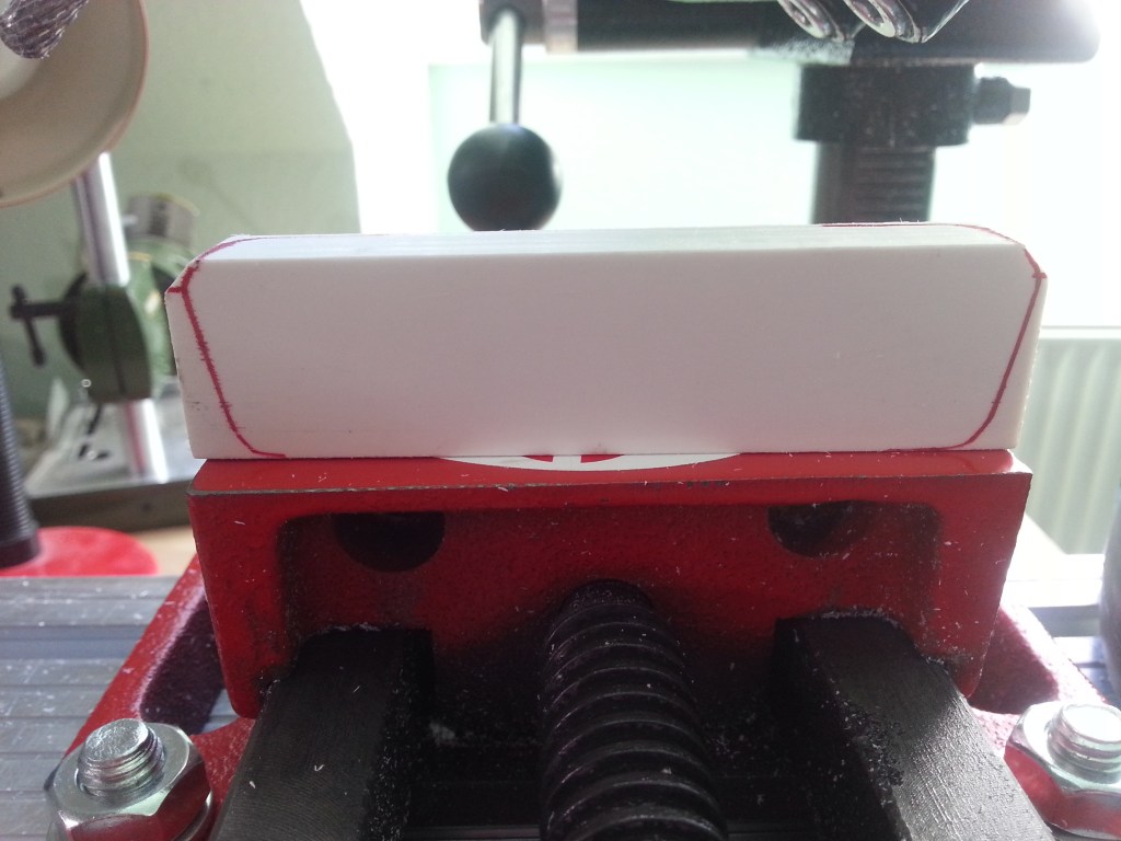 … und schrittweise bis zum markierten Abschluss herunter gefräst. Die links noch sichtbare Linie, wurde so schräg in den Maschinenschraubstock eingespannt, dass auch hier eine horizontale Fräsung möglich wurde.