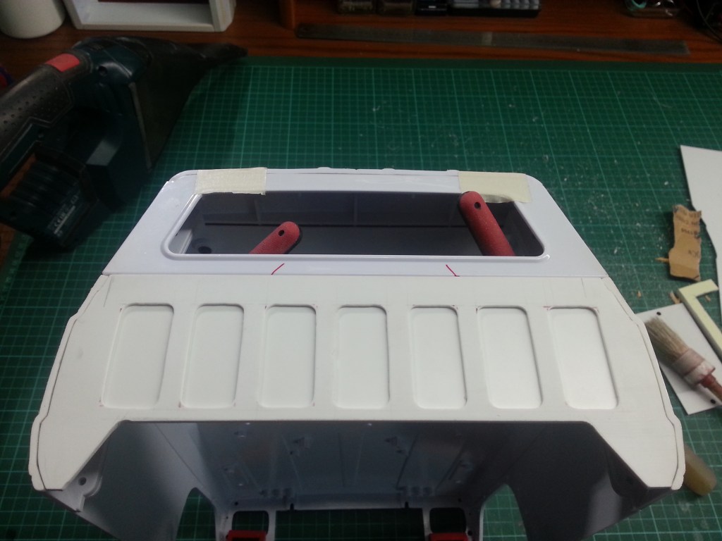 Mein Augenmerk galt ab diesem Zeitpunkt für lange Zeit dem Fahrerhaus. Da es im Vergleich zum Original zu kurz ist, wurde es kurzerhand verlängert. Am Dach und den beiden Seitenteilen. Das daraus entstandene Ergebnis, ein Fahrerhaus für einen Comanche Truggy, wurde im letzten Beitrag vorgestellt. Der Weg zu diesem Fahrerhaus war kein einfacher Weg. Für mich zumindest, da ich mit der Verarbeitung von Polystyrol und ABS, bis zu diesem Zeitpunkt keinerlei Erfahrungen hatte. Dazu kammen auch die vielen Fragen, wie eine Karosserie überhaupt zu bauen ist. Angesichts des inzwischen von mir gewählten Weges und fortgeschrittenen Baustandes, eine auch weiterhin offene Frage. Die unvermeidlichen Härten des Geländefahrens werden irgendwann diese Frage beantworten. Und so sieht das Truggy-Fahrerhaus im Moment aus.