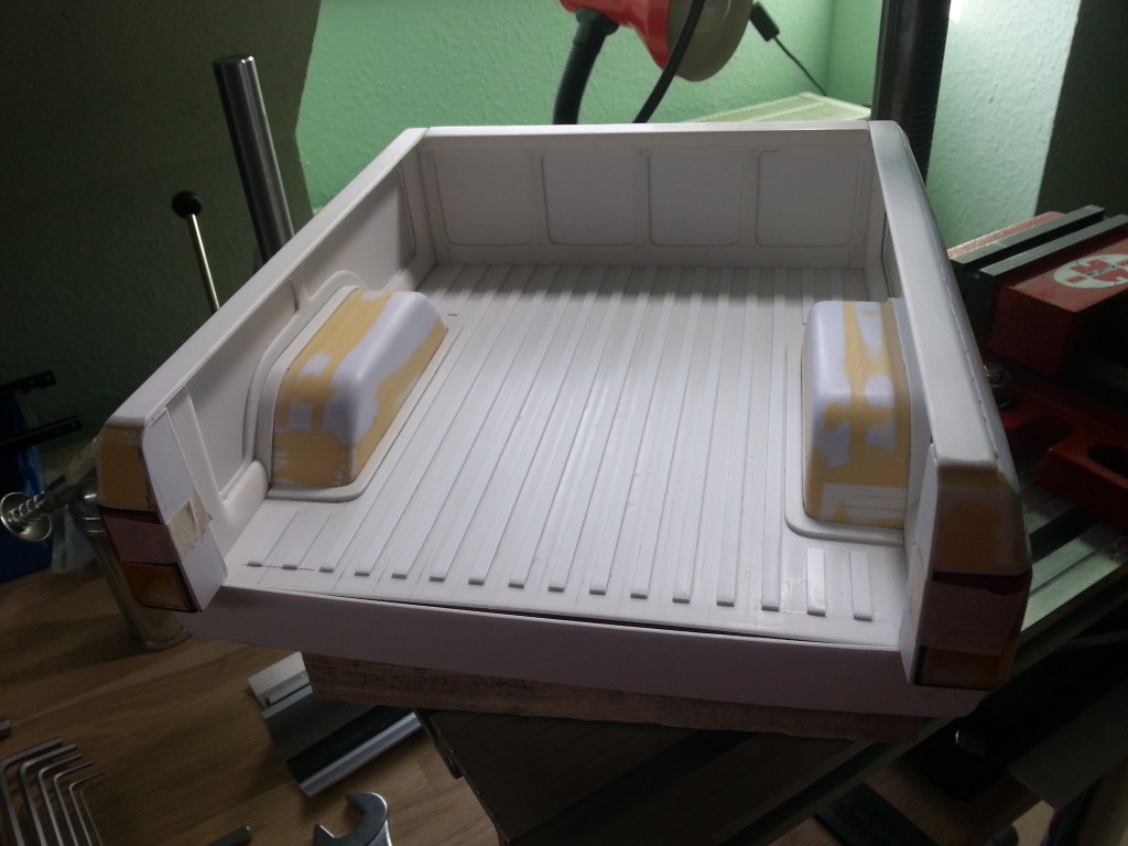 Eine Großbaustelle wurde schliesslich die Ladefläche. Sie wurde restlos zersägt. Stirnseite- und Ladebordwand wurden entfernt und ebenso die komplette Ladefläche. Hier ist der Baustand relativ zeitnah, aus den letzten Beiträgen ersichtlich. Sie ist schon im Rohbau ein echter Blickfang geworden. Von oben …