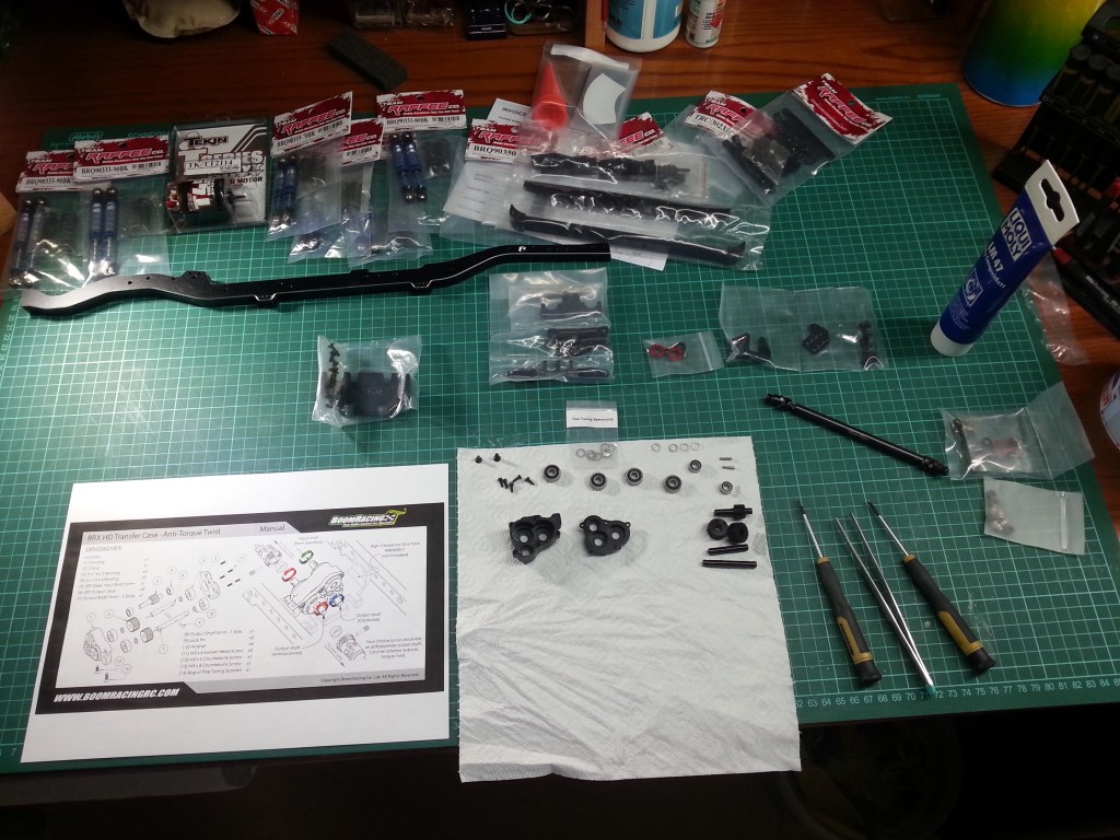 Neben dem Rahmen habe ich mich noch für eine technische Besonderheit entschieden. Das Mittelgetriebe aus dem neuen BRX01, ist auch als Umbausatz für die Defender-D90/110-Rahmen erhältlich. Es wird als Torque-Twist-Getriebe bezeichnet. Mit der Bezeichnung torque twist, beschreibt man das gegenseitige Verdrehen der Starrachsen. Das Drehmoment des Antriebsmotors und die gleiche Drehrichtung aller Wellen erzeugen diese Kräfte. Dazu eine schematische Darstellung der Fa. Boom Racing als PDF.