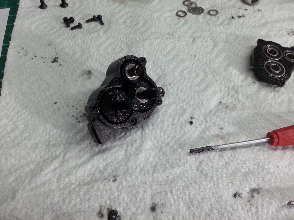 Im nächsten Schritt Achsen, Zahnräder und Abstandsscheiben montiert.