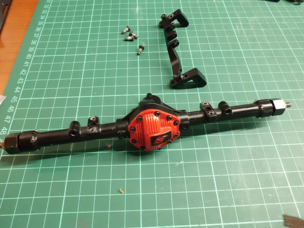 In the following, therefore, the axis rotated horizontally by 180°. In the background the previous parts. In front one of the link mounts. Instead of the upper side, it is now mounted on the lower side. On the axle housing is an identical part and the bridge already mounted. The cover is now upside down like the rest of the axle. By the way, the connecting bridge is identical to the BR tuning part already installed by me in the milled version, but the original delivered part fits as well.