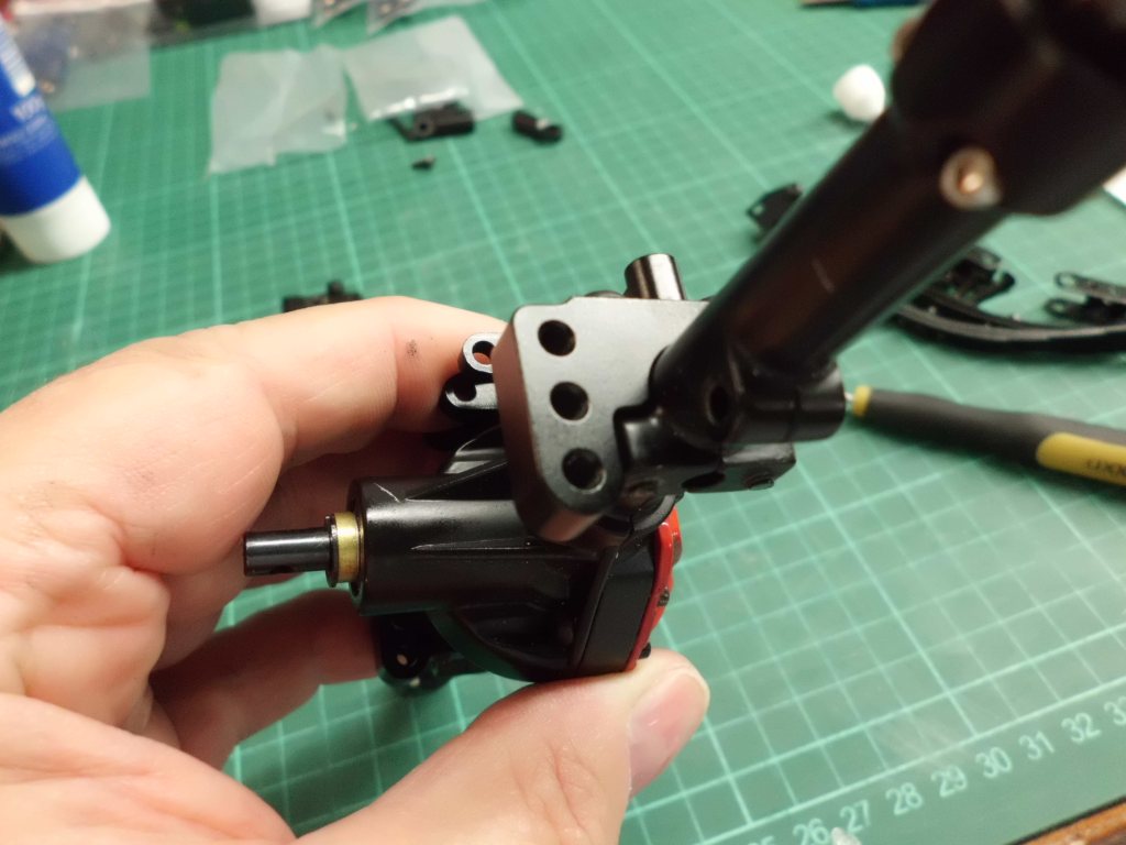 Nachfolgend also die horizontal um 180° gedrehte Achse. Im Hintergrund die bisherigen Teile. Davor eines der neuen Bauteile. Anstelle der Oberseite, wird es nun auf der Unterseite montiert. Am Achsgehäuse ist ein identisches Teil und die Brücke schon montiert. Der Deckel steht nun, wie auch der Rest der Achse, auf dem Kopf. Die Verbindungsbrücke ist übrigens identisch wie das bereits von mir verbaute BR-Tuningteil in der gefrästen Ausführung, Das Original gelieferte Teil passt aber auch.