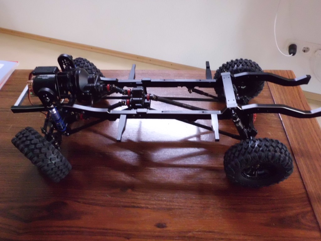 Before the further work on the cab, I want to install the steering servo, speed controller and receiver. The chassis is prepared for a first driving test.
