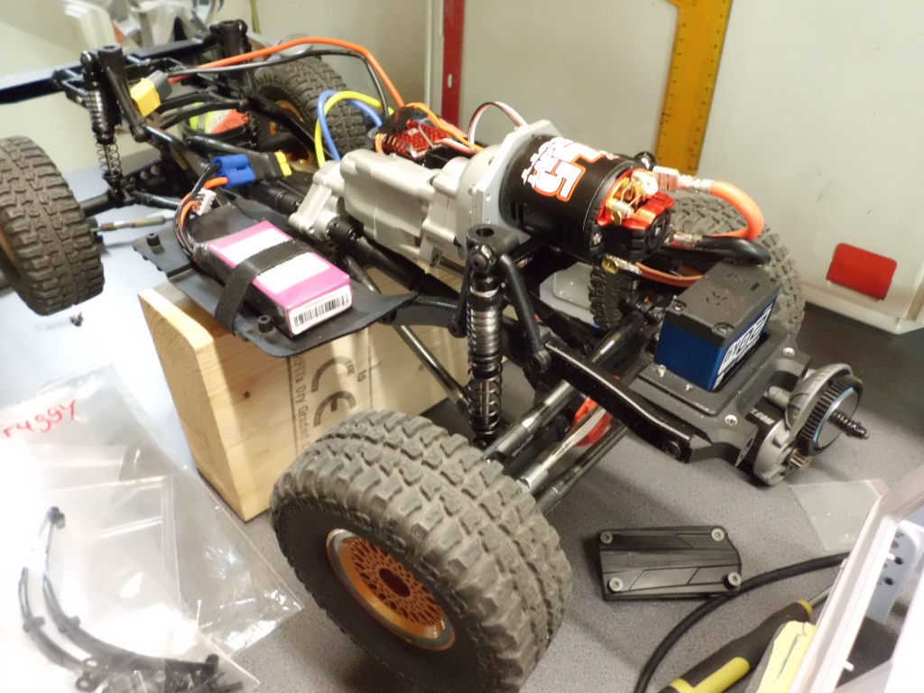 In der aktuellen Konfiguration bin ich das Fahrgestell dann eine Stunde gefahren. Geschaltet habe ich von Hand, da das Schaltservo noch fehlt. In Verbindung mit dem 45T-Motor, war feinfühligstes Fahren und Rangieren möglich. Selbst im zweiten Gang ist souveränes Geländefahren nach möglich. In anspruchsvollem Gelände ist aber der 1. Gang die bessere Wahl. Der jeweils eingelegte Gang, ist eindeutig an der Geräuschkulisse erkennbar. Dabei gibt es auch einen Leerlauf, der ohne Schaltservo, dass eine oder andere Mal aktiviert wurde. Der Gangwechsel war unter Last problemlos möglich. Mein Fazit, Euphorie mit steigender Tendenz. In Verbindung mit dem Dämpfertuning, eine begeisternde Kombination. Dem Arbeiten der Dämpfer und Reifen zuzusehen, beim Überfahren von Bruchsteinen, als auch im Sandkasten meiner Enkelkinder, waren echte Höhepunkte. Jetzt sollte ich mich unbedingt an die Karosserie und den Innenausbau machen, damit der Wagen auch als Auto erkennbar wird. 🥰