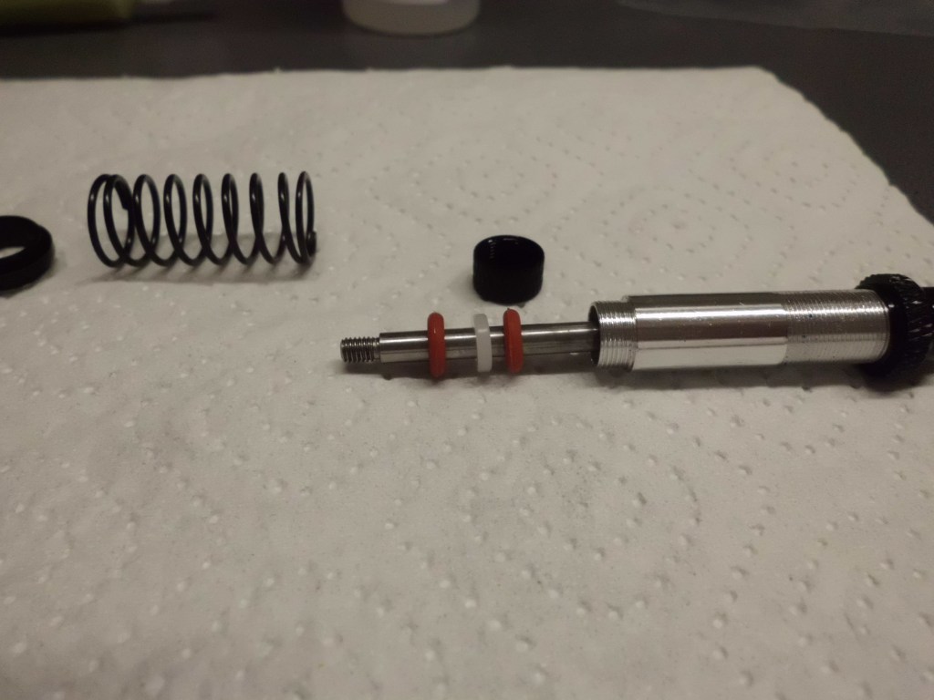 Ich hatte vorne bereits Team Raffee-Dämpfer eines Forumskollegen verbaut. Deren absolut tadellose und geschmeidige Funktionsweise fiel mir erst richtig auf, nachdem ich die neuen TR-Dämpfer verbaut hatte. Bockig und mit einseitig unterschiedlicher Funktionsweise, eher etwas enttäuschend. So ergab eine erneute Kontaktaufnahme mit dem Forumskollegen, neue und wichtige Erkenntnisse bei der Dämpferoptimierung. Die bisherigen Axial-Dämpfer waren für reine Kunststoffdämpfer schon bemerkenswert gut, hatten aber Optimierungsbedarf. Meine Versuche den Bereich der Kolbenabdichtung zu schmieren war nicht von dauerhaftem Erfolg gekrönt. Dabei wird der Dämpferkolben von zwei O-Ringen gedichtet. Dazwischen liegt noch eine Führungsscheibe. Alle Bauteile sind passend zur Kolbenstange, absolut spielfrei. So entsteht durch die Bewegung der Kolbenstange eine permanente Reibung. Technisch nennt man das Losbrechkraft. Das führt zu ungleichmäßiger bis ruckelnden Bewegung der Kolbenstange in den O-Ringen. Meine Versuche diesen Bereich gesondert mit Öl zu bearbeiten, war eine akzeptable Verbesserung, aber nicht von Dauer und damit keinesfalls perfekt.