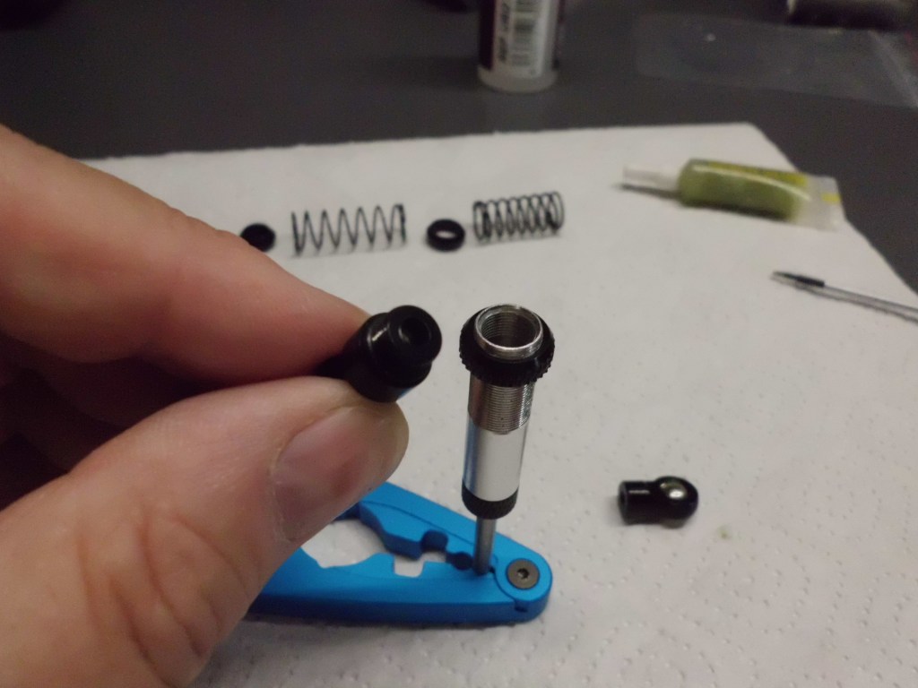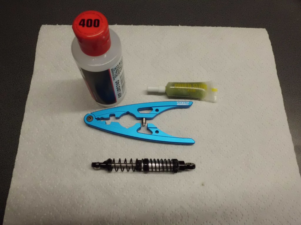 The tools and lubricants for a perfect work result. The blue shock absorber pliers from Tamiya have various notches for clamping shock absorber housings and rods. With the pin in the middle and the opposite support, even ball heads can be pressed in. Also silicone oil from Ultimate Racing and Team Associated Green Slime.