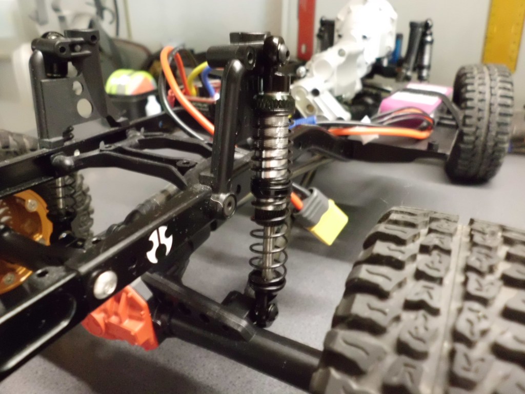 Bei diesem Umbauschritt wurden auch andere Dämpfer verbaut. Team Raffee-Alu-Dämpfer, vorne und hinten jeweils 80 mm lang. Das Original hatte 90 mm. Damit liegt mir der Wagen aber zu hoch. Kürzere Dämpfer sind ohne weitere Umbauten, aber derzeit nicht zu montieren. Das führt bei starkem Einfedern zur Berührung von Bauteilen, insbesondere dem Panhardstab und der Vorderachse.