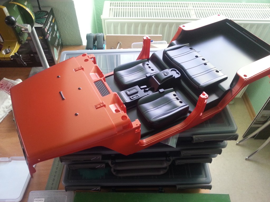 We continue with a complete interior design. It needs some rework, at least according to my imagination. The seat backs can be mounted and screwed from below. Mirrors with chrome inserts are included as well as the hood holders and door handles. At the by means of screw-in pin, movable doors, there is also an interior lining. For about 60, – € one should not actually grumble there. In my case this is more due to a slip in the color description and my high demands. The bottom line is a bodywork recommendation, for little money and a lot of volume. You can make it better according to your own ideas.