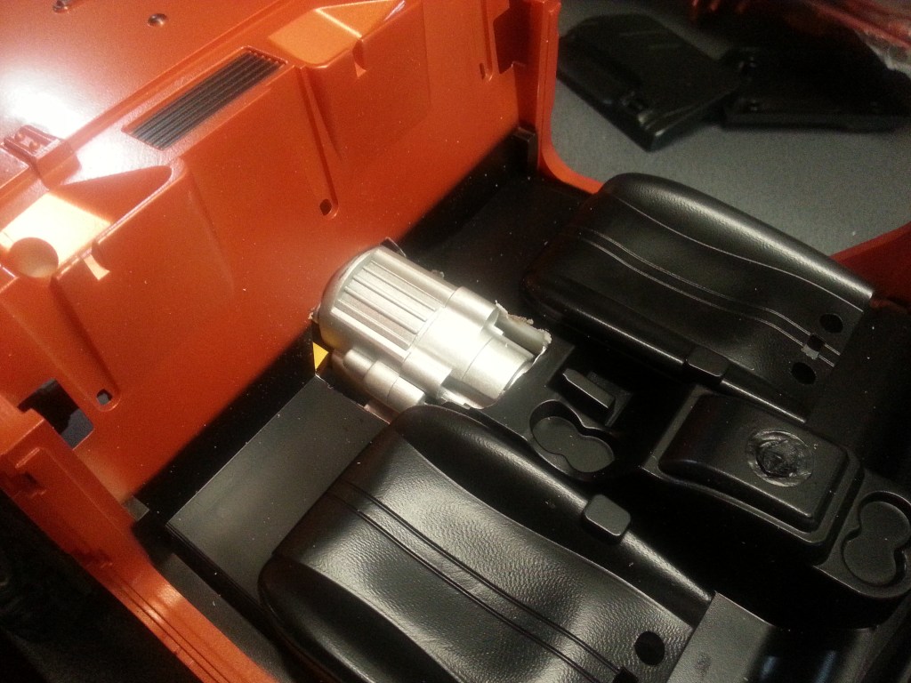 Das war es allerdings noch nicht mit meinen Problemen. Keine meiner Stoßstangen, vorne wie hinten, passen zum Jeep JK. Zu allem Überfluss ist das Schaltgetriebe zu hoch und breit, um im Kardantunnel des JK Platz zu finden. Die ersten, noch unvollständigen Trennarbeiten sind im Foto dokumentiert und auch noch nicht abgeschlossen. Hätte ich allerdings das originale SCX10 Getriebe weiterhin montiert, wäre jetzt anstelle der hinteren Sitzbank und einem Teil der vorderen Sitzlehnen, ein ziemlich großes Loch im Fahrzeugboden… 😥