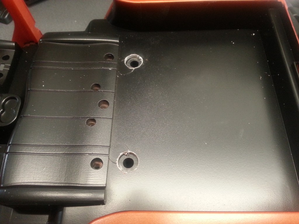 Die Dämpferdome des SCX10 passen ebenfalls nicht unter den schon hoch eingebauten Ladeflächenboden. Also auch da wieder Löcher machen. Auf dem Foto nur die Anfänge, es muss noch deutlich größer herausgearbeitet werden.