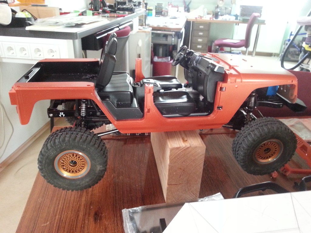 Der JK macht so noch einen ziemlich aufgebockten Eindruck, mit nur 80 mm langen Dämpfern. Beim Einfedern sieht es dann aber weniger schlimm aus. Vielleicht wird das durch die noch nicht montierten Kotflügel noch verstärkt. Auf diesem leider nicht ganz so optimalen Bild, ist das Heck auch noch nicht vollständig abgesenkt. Das werde ich dann irgendwann noch nachholen…
