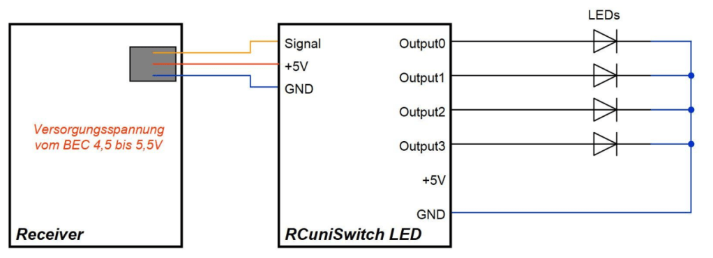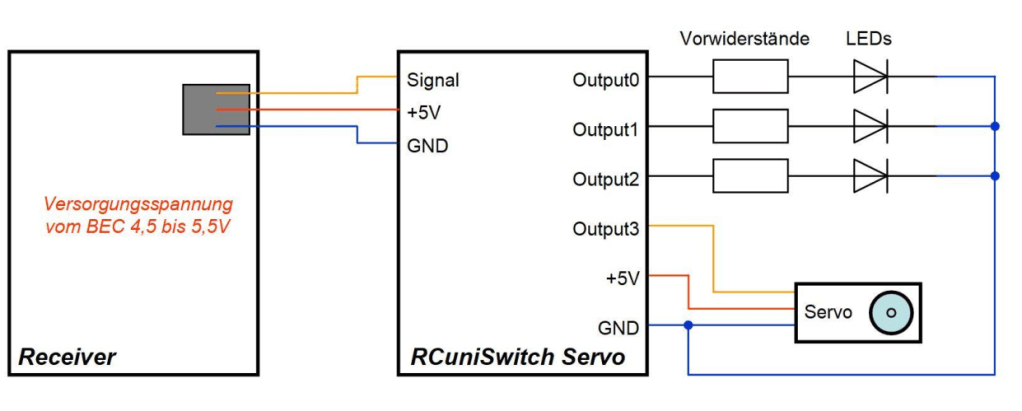 Für verschiedenste Steuerungsfunktionen sind 3 Module verfügbar. Jedes Modul kann an einem Empfängerkanal, bis zu vier Erweiterungsfunktionen bereitstellen. Nachfolgend die Module und ihre Funktionen