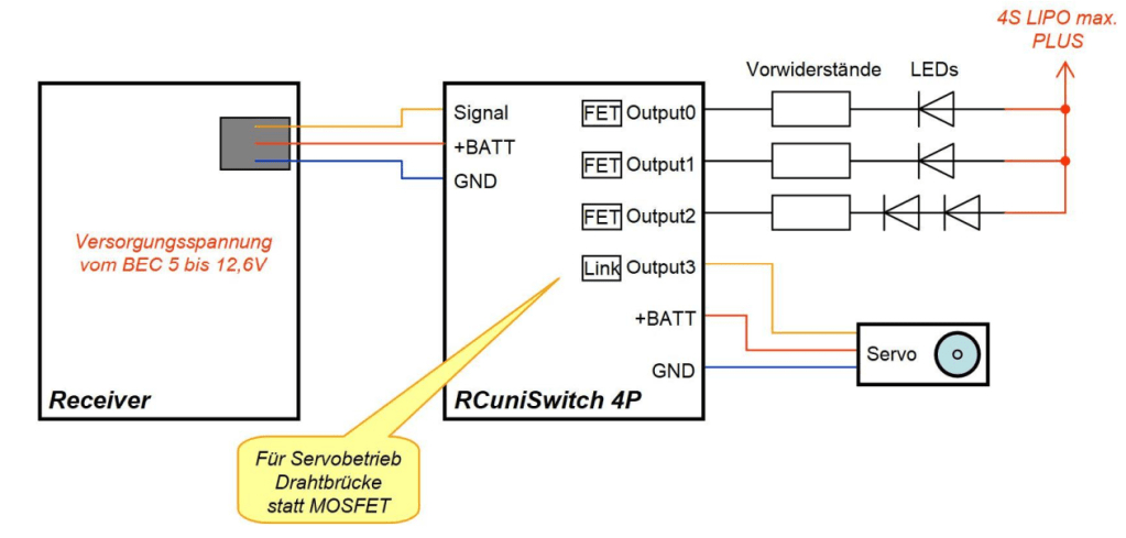 Dieses Schaltmodul unterscheidet sich von den beiden einfachen Modulen insbesondere dadurch, dass es dank MOSFET-Ausgangsstufen größere Ströme und Spannungen schalten kann und wegen einem eigenen Spannungsregler für eine höhere Betriebsspannung (vom BEC kommend) geeignet ist. Aber auch ein Servo kann angeschlossen werden. Hierzu muss nur statt dem MOSFET eine Drahtbrücke eingesetzt werden: