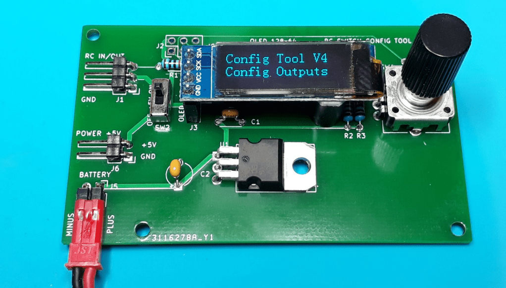 This switching module differs from the two simple modules in that it can switch larger currents and voltages thanks to MOSFET output stages and is suitable for a higher operating voltage (coming from the BEC) due to its own voltage regulator. But also a servo can be connected. For this purpose, a wire jumper must only be used instead of the MOSFET: