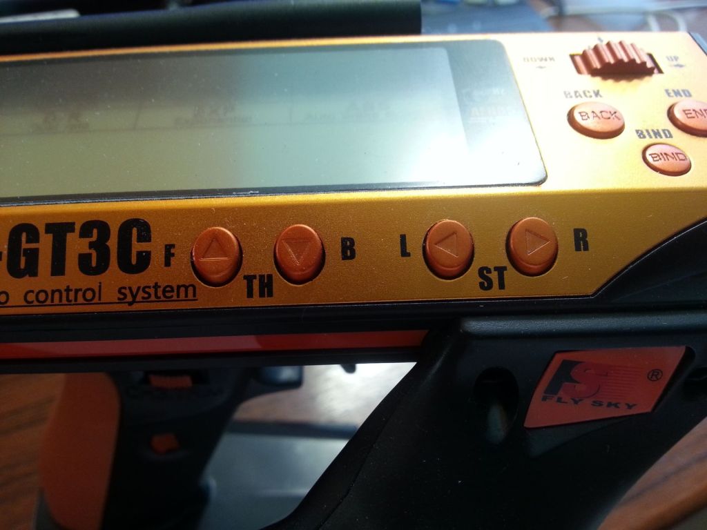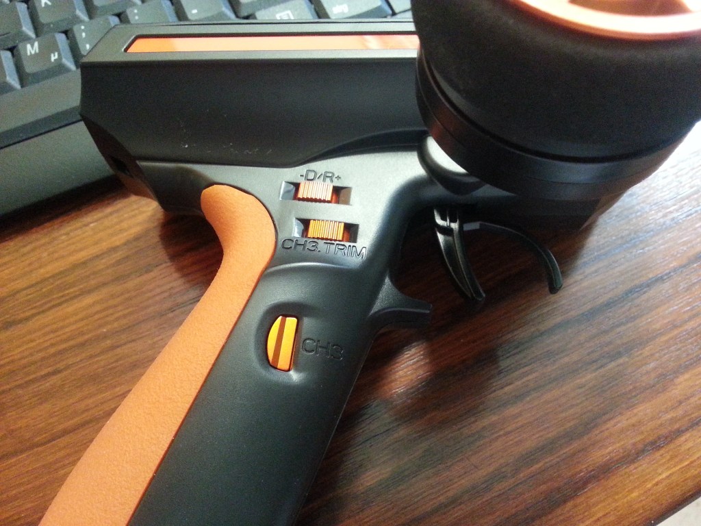 The trim buttons „right“ and „left“ below the display are actually used for trimming the 1st channel (steering), „forward“ and „backward“ for trimming the 2nd channel (gas). On the top of the handle there is the Dual Rate button, the lower rocker (the middle button) is the second trim for channel 1.